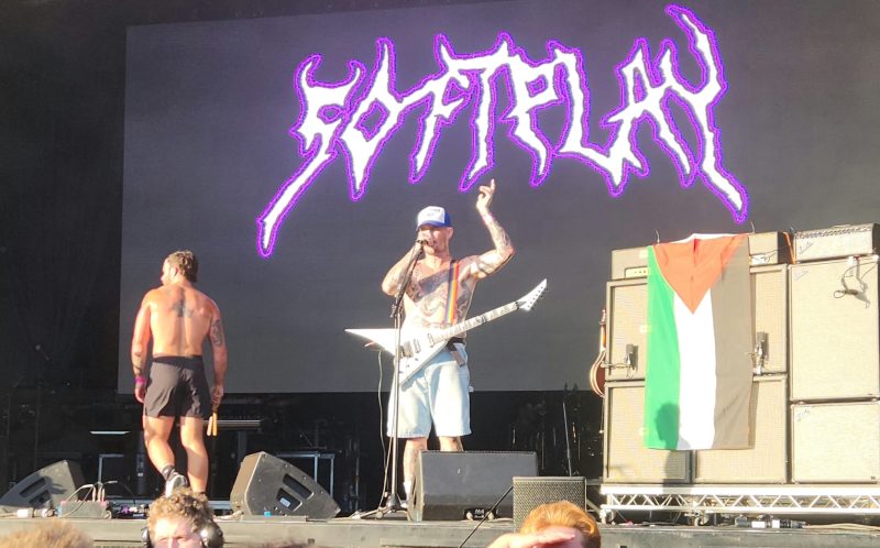I dash to find a good space, just in time to catch all the artists on the bill on stage led by IDLES guitarist Mark Bowen giving a plea to help medical aid for Palestinians, with a QR code large on the screen for donations.