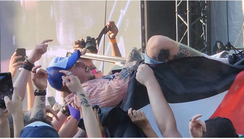 In a moment of rare quiet Free Palestine chants fill the air and are reflected back at us by the band, showing solidarity between artists and crowd. It feels like glimpsing half of Bristol in the all-consuming mosh pit, where I share a crowdsurf with Mould bass player Kane.
