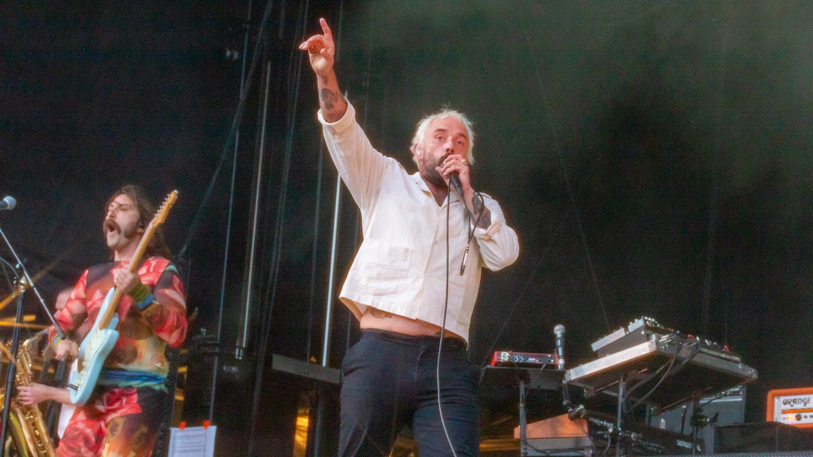 All Things Bright and Beautiful pumps into the summer air and we shuffle close. I can tell things are going to get lively here. As if the energy needed lifting Soft Play fly out onto stage, singer and full-body drummer Isaac Holman flexing his best punk rock Mirror Muscles.