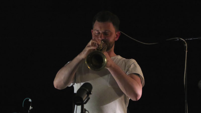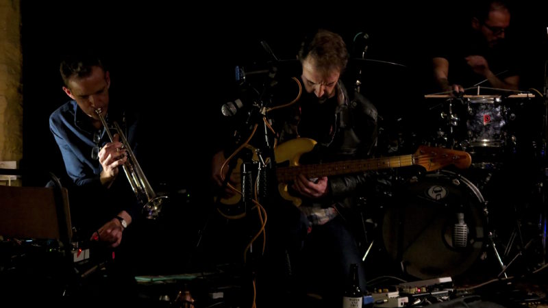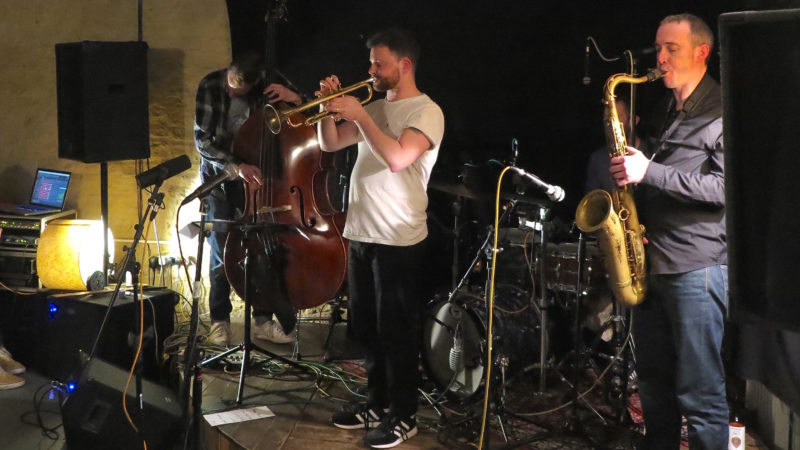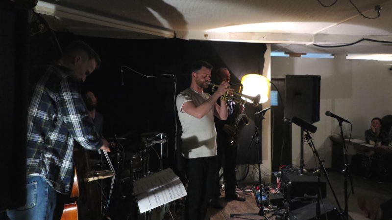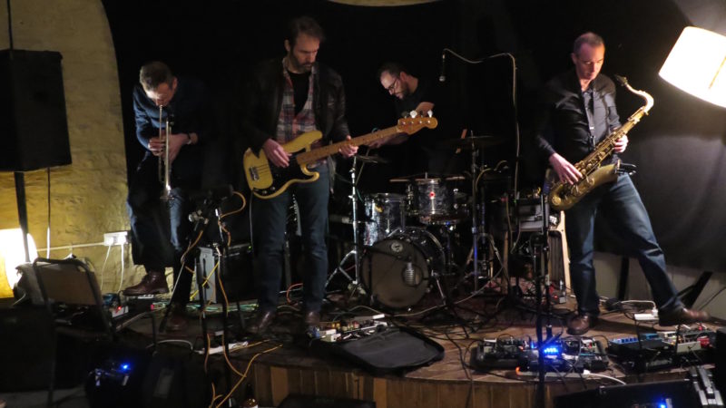 Next up, new combo KRAKE had come from an encounter between Portuguese percussionist Pedro Oliveira and Bristol’s Get The Blessing, resulting in a collaborative improvised album (without GTB drummer Clive Deamer). This was supposedly the album launch, giving saxophonist Jake McMurchie the chance to air the well-worn “that was another track from our completely improvised album” joke. Each of the four musicians was deploying an arsenal of electronic effects, meaning that Jake, bassist Jim Barr and trumpeter Pete Judge spent much of the set crouched low over flickering LED lights, while back in the shadows Pedro prowled around his kit and pored over his own case of electronica. He is a drummer of the toy box school, deploying an endless litany of things that clank or whirr as well as his drum kit, all making source sounds for digital reinterpretation.
