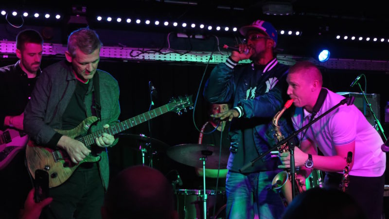 After Pee Wee left the stage guitarist Angelo Bruschini joined the band for Eternal Finale, a loosely rolling hip-hop number fronted by US rapper Shondel The Kamikaze with Angelo’s ethereal solo style a good balance to Charlie Allen’s crisp rhythm playing. There was more acerbic guitar from him during the ambitious Raiders, a longer programmatic instrumental piece about bank robbers. That tune was the cue for Ian Matthews to really let rip on drums in a thunderous outburst that saw sticks fly from his grasp while James stoked a scorching solo and the band came together in a grinding rock riff to close the piece.