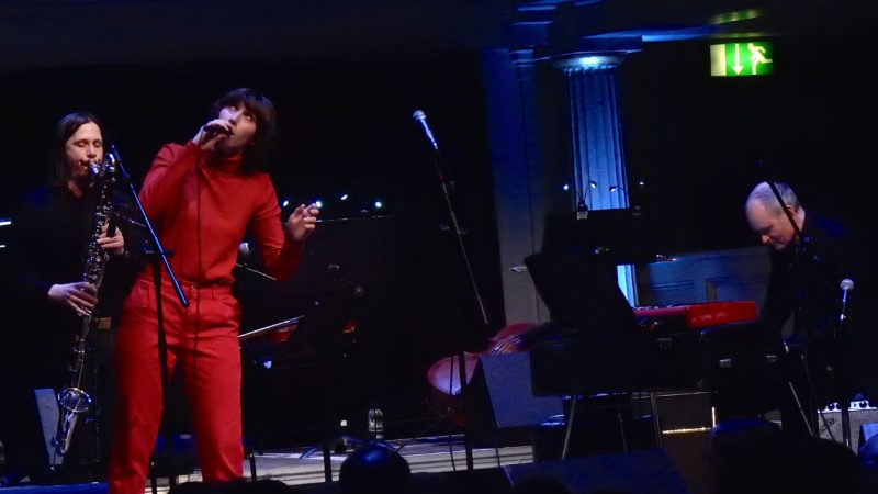 The most startling performances came from New Zealand alt-folk singer Aldous Harding. Clad in bright red she brought the distracted air of someone who just woke from an odder dream and doesn’t yet trust this one. When she intoned ‘Never held emotion in the palm of my hand’ during an epic reading of Northern Sky you felt she had discovered that thought herself just before she sang it in her rather muffled alto octave before sparkling into a higher register. She shared crisp vocal duties with Huw on Three Hours, the song’s extended payout given a cracking prog pace and pulse by John’s keyboards and Jeremy Hogg’s guitar that suggested the early Pink Floyd and Can that would have been Nick Drake’s contemporaries.