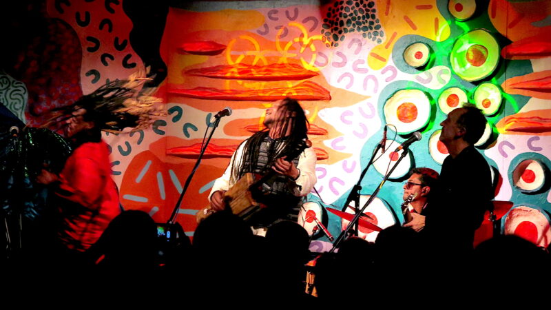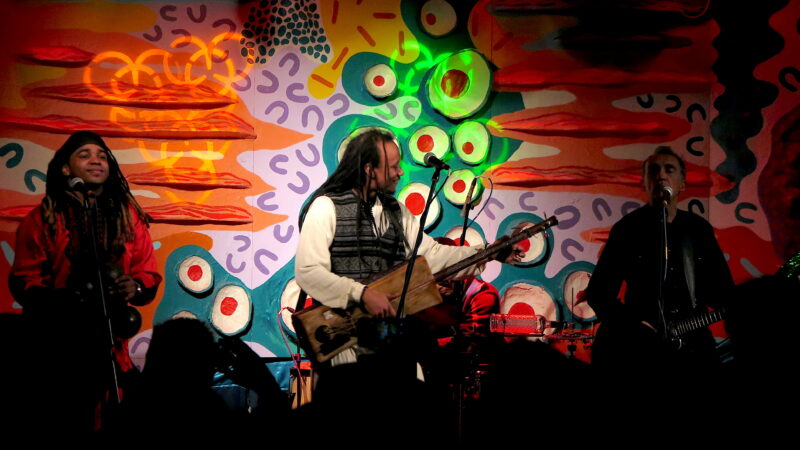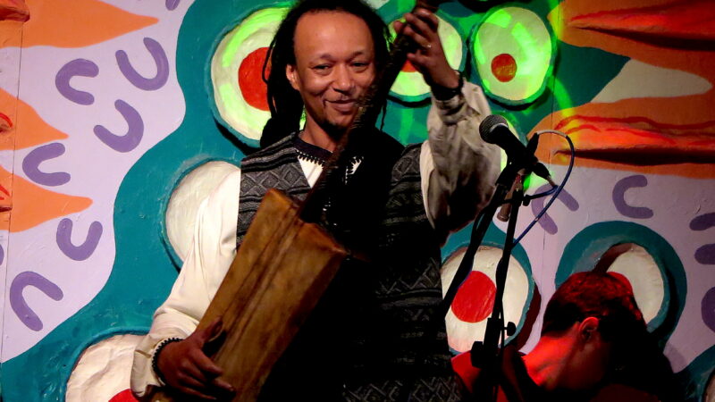 Justin’s longstanding immersion in ‘Desert Blues’ guitar has given him a proper understanding of the economies of style Gnawa music relies on – it is intended for lengthy trance-inducing dances, after all – and thus even when he used the more dirty effects pedals the contrast of tone felt appropriate. Indeed, they even transposed the classic American country song Wayfaring Stranger into a kind of Desert’n’Western number without breaking their North African spell, especially when it speeded up into a percussion-led Dervish frenzy that had Driss spinning onstage (as far as space would allow). But, again, it was the more traditional 6-time Moroccan numbers that really got the audience moving, the relentless groove punctuated by stinging guitar phrases and underpinned by that visceral guembri bass.