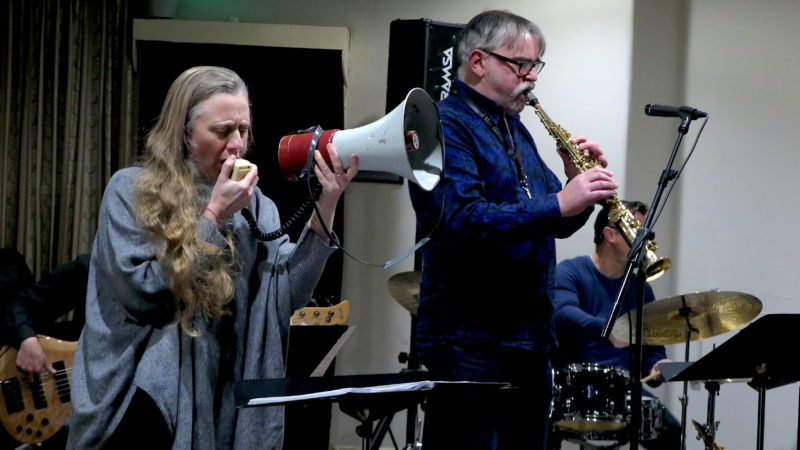 Opening with the Orwellian More Equal Than Others they set out their stall perfectly in a series of contrasting sections that saw Figes alto flute and vocalist Brigitte Beraha’s pitch perfect unison lead to a fragmentary moment of vocal plipper-plopping swept aside by Jim Blomfield’s prog-informed synth voluntary. A narrative section of voices from Animal Farm was unsettlingly propelled by Mark Whitlam’s militaristic snare drum and undermined by mocking soprano sax until everything got a little out of hand and Brigitte began berating us through a howling megaphone.