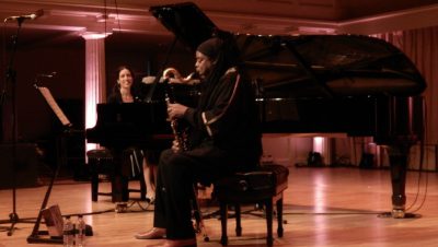 The discipline of the Mammal Hands sound was apparent from the start as Nick Smart’s rolling repetitive piano riff wove a strict tempo chord sequence gently underwritten by Jesse Barrett combining stick and hand percussion. Once he’d finished fiddling with his impressive array of effects footwear Jordan Smart (yes, they’re brothers) eased in a looping tenor sax phrase, thickened electronically and locked perfectly to the beat. The Smarts started out making electronic dance music and the structure of the pieces reflects that: often a theme slowly built before stripping back to its pulsing core, leading to a climactic ending.