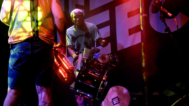 By contrast trumpeter Matt Doe is totally static, playing trumpet straight into a microphone with one hand while steadily keeping a drink in the other. It’s a yin-yang thing that only amplifies the sense of movement alongside him. In the shadows at the back of the stage David Parks somehow embodies both aspects, physically flailing throughout yet immobilised by the complex home-made percussion rig hung from his waist. Small wonder that by the second number his T-shirt is already sweat drenched.