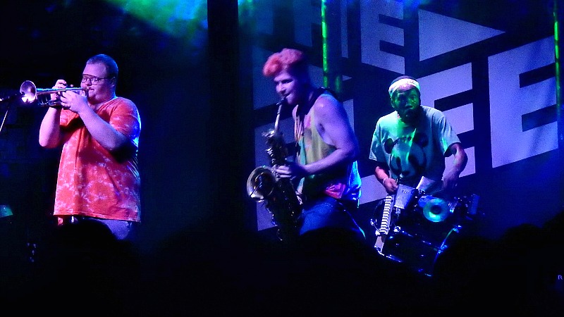 The Fleece packed to capacity through DJ Cheeba’s ‘what will he slip in next?’ warm up set, with a palpable sense of anticipation in the air that roared its welcome when the band finally emerged. Two minutes in and the front half of the crowd was dancing, urged to action by baritone sax player Leo Pellegrino’s hyperactivity on stage. For a man carrying a big heap of brasswork he’s amazingly kinetic, pacing, gyrating, shimmering and twerking from the first blast of his deep-voiced saxophone.