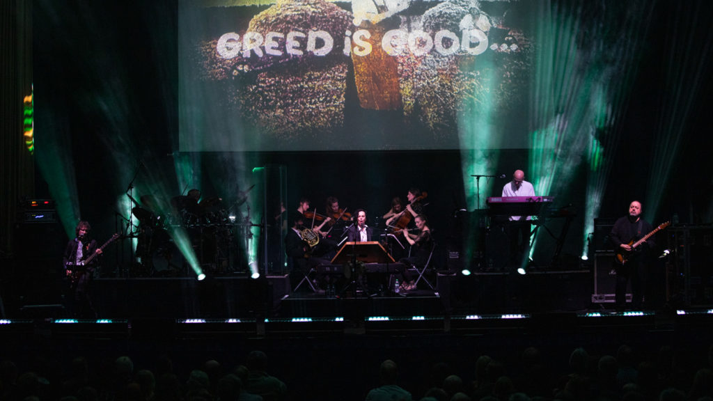 The only disappointment of Marillion’s Colston Hall performance last April was that they didn’t play Fuck Everyone and Run‘s standout epic The New Kings, which tackles oligarchs, trickle-down economics, ‘too big to fail’ banks, council house sell-offs and fake news, while yearning for “a national anthem you could sing without feeling used or ashamed”. Tonight we get the full multi-media works, which proves to be the show’s highlight.