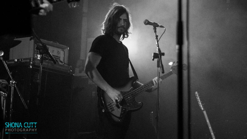 The band played a non-demonstrative set for the most part, no foot on the monitor whilst gurning; no skipping around the stage or flamboyant shape throwing, in short, no rawk star shenanigans. Jacques solid throughout, locked on the spot and locked in the groove, funky at times and shadowing the riffs when needed. The up-tempo tunes were powered by de Gheest, but he had plenty of finesse for the slower songs too and really had the post punk tribal beat down pat, a dance groove woven in to the mix. Struyf washed the songs with keys, atmospheric and darkly melodic: seated for some tunes with guitar and keys, on his feet for others; terse rhythm guitar leaving space for Fielder. The latter was a constantly moving, a tight ball of energy throughout, persistently tip-toed ducking and weaving as he led the tunes – reverb drenched surf sci-fi guitar; nocturnal riffs, strangled solos; the epitome of restraint and less is more. Apart from a number of blinding solos that is…like the chiming victorious solo on Harbourview Hospital.
