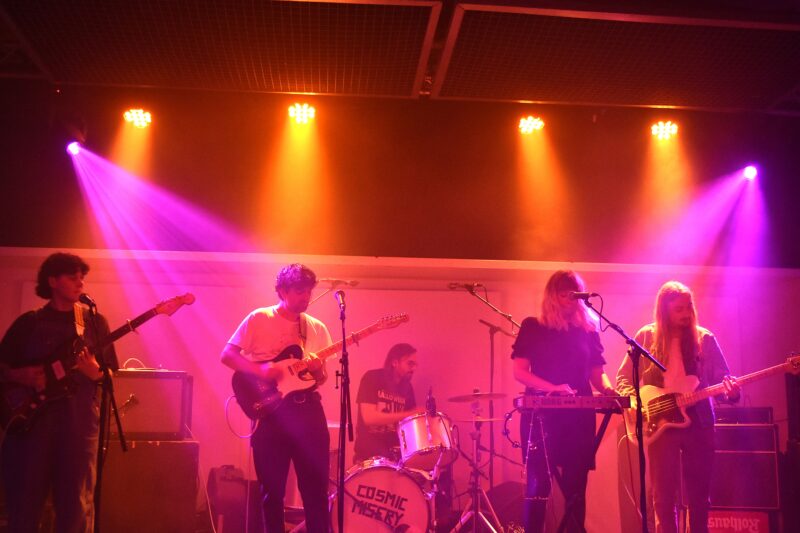 Fearghall’s distinctive falsetto vocals, reminiscent of Grandaddy or Flaming Lips, rise above the sextet’s jangly guitars, catchy hooks and upbeat energy from the beaming korg player.