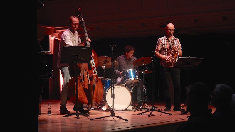 Things sharpened up a little on a tribute to US drumming legend Ed Blackwell, though ironically this piece was driven by the drummers metronomic left hand tapping out a rigid 6-time rhythm. The piece closed with a charmingly woven bass and drum duet that was rich in melody and neatly timed. It was on the Rollins-esque bop of Spring Dance, however, that Ethan Iverson let slip his otherwise impassive and restrained presentation in an angular solo, left hand crashing down in occasional explosions while the other broke up rippling runs with jabs and stutters as he bounced off his piano stool.
