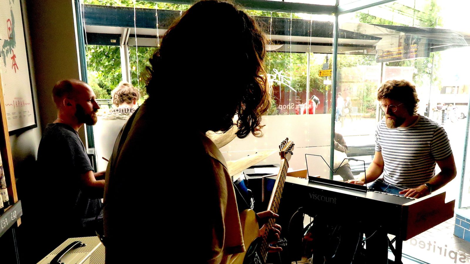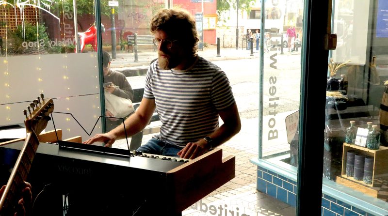 It was as fine a display of empathetic group improvisation as you could see anywhere, at any price, and here we were getting it for free in a North Street shopfront. As were the passers by, whose brief responses are always an extra cabaret dimension in these situations and which varied from complete bemusement and studied indifference to delighted appreciation. Some even took advantage of the adjacent bus stop to sit awhile and enjoy the music, little realising that they were on the very spot where the musical trio had sat before the gig.