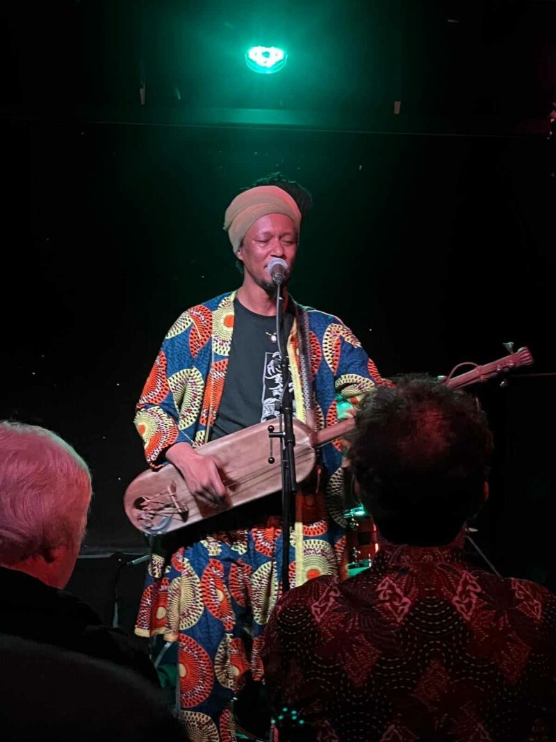 Now a Bristolian, Mohamed Errebbaa is an acknowledged master of his native Gnawa music. Steeped in Sufi ritual and Muslim hymns, his driving and artful riffs on the guembri – the traditional three-stringed bass lute – unlocked rhythmic possibilities as his graceful singing soared above.