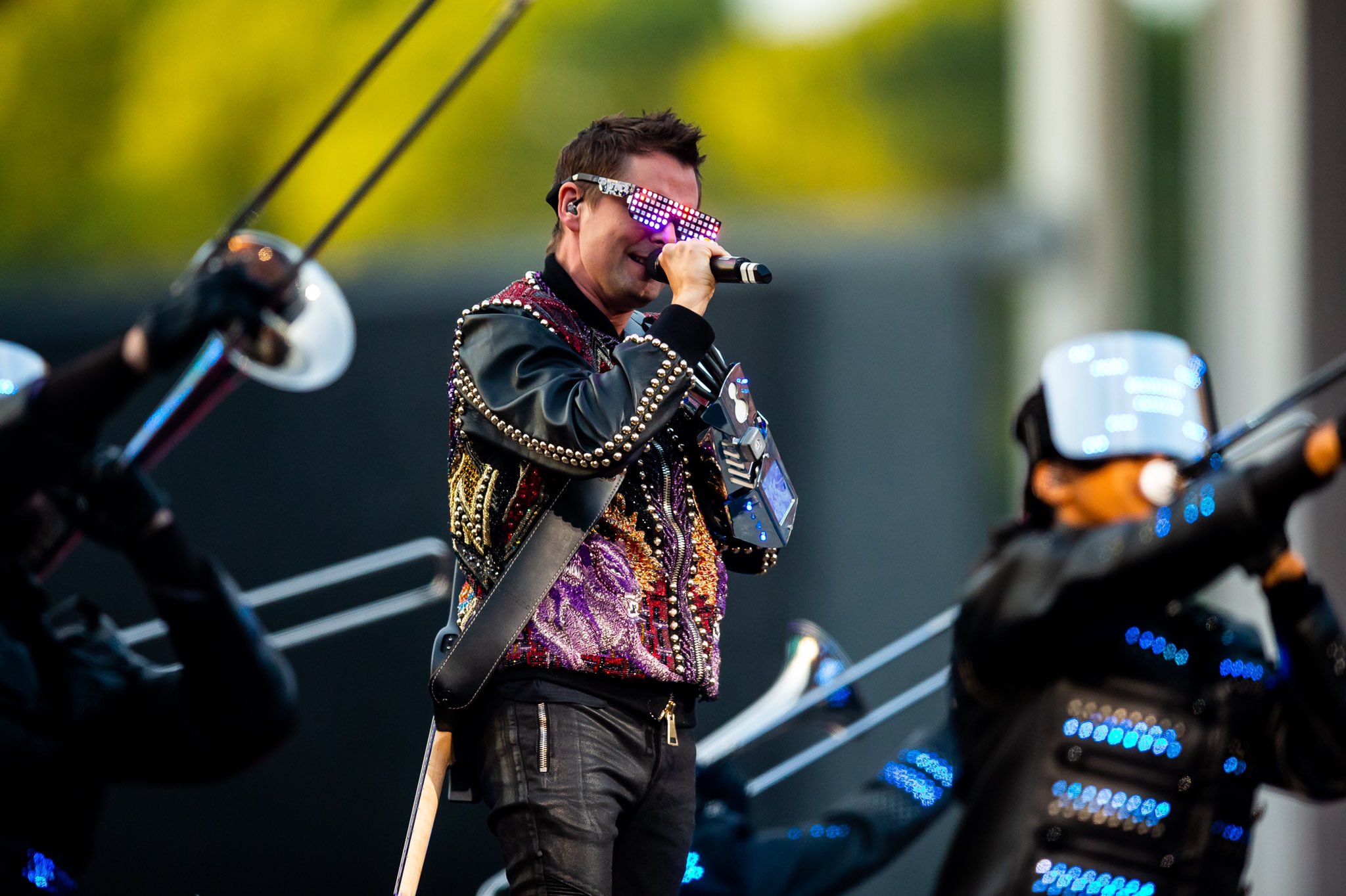 Matt Bellamy emerged from the depths beneath the stage, triumphant and already shredding his guitar, surrounded by trombonists donned in blue and green light vests. His band arrived at Ashton Gate Stadium in true style, radiant in the darkening evening light, piercing the skies with their sound.