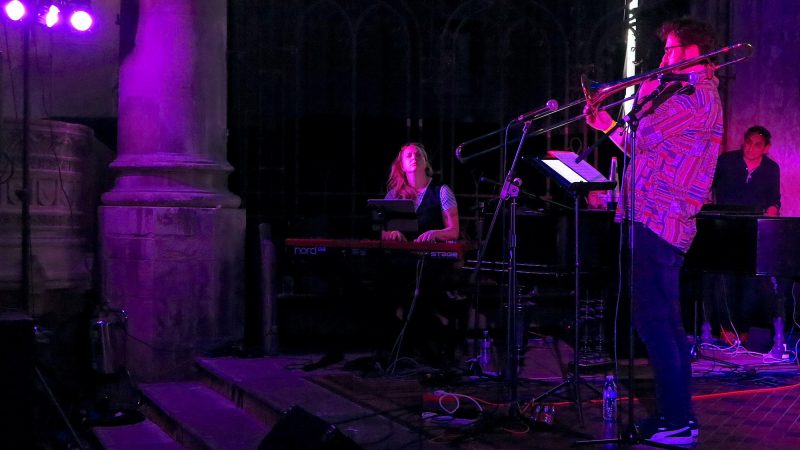The duo of pianist Rebecca Nash and trombonist Raph Clarkson had never played the festival before. In fact, they had never played together before anywhere but both are courageous and inventive improvising musicians. Their set was a masterclass in duet playing as each tune was shaped and reshaped. The melodic responsibility flowed seamlessly between the two players, the harmonic developments so empathetically shared it was hard to believe this was their first performance together. There were moments of deep spirituality in Ralph Towner’s Celeste, fulsome vocalising trombone urged on by thickening piano chords, and a fine audience-rousing South African roll to Raph’s Wise and Waiting. It’s to be hoped that they will do this again in the future.
