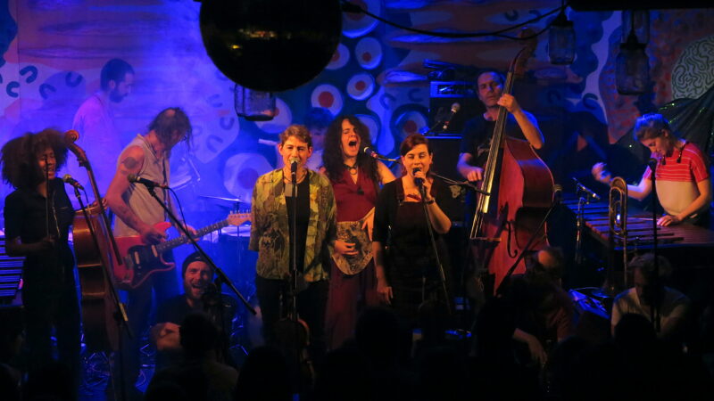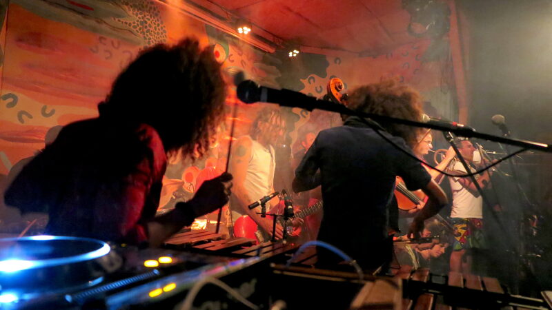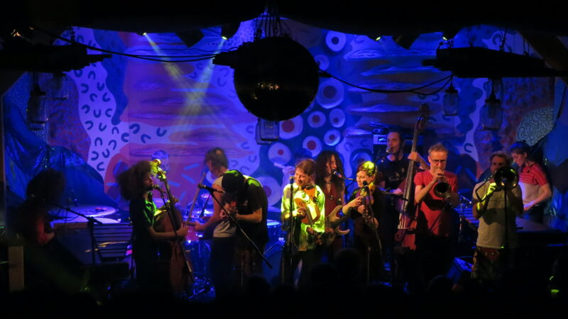 They started, like any orchestra, with the strings tuning up together – but this was more for performance value as it led into the droning chord intro for Be Patient, the opening track from Swiss visitors Orchestre Tout Puissant Marcel Duchamp’s latest album We’re OK But We’re Lost Anyway. A pulsing double bass, scattered percussion and looping marimba riff took over and the vocal arrived. Be Patient, indeed – the tune’s sombre restraint and gentle vocals were a misleading preparation for the roistering punk-jazz-dance fest that would follow it. By that point the Jam Jar was gratifyingly crammed, not least on the stage where the Orchestre’s 13 musicians somehow found the space to move relaxedly, bobbing up and down as they came in and out of the arrangements.