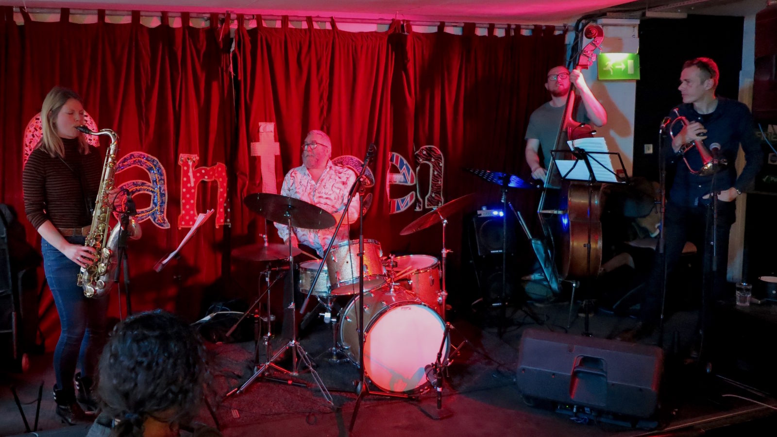 It’s always interesting to see a new jazz project take shape, especially one involving players already well-established in other successful bands. What’s the USP going to be, especially if they are not starting with a set of original music? This was Orphic’s debut gig, a quartet centred around Sophie Stockham’s tenor sax with fellow Dakhla Brass players Pete Judge on flugelhorn and Matt Brown drumming plus We Are Leif double bass player Chris Jones. The ever-busy Matt was elsewhere, however, hence the gig’s original billing as ‘Orphic Trio’ (which led to an interesting on-line confusion with a noted classical three-piece of that name) then, on the day, they actually were a quartet thanks to drummer Tony Orrell choosing to spend his birthday afternoon on the Canteen stage. It proved to be a fine combination albeit understandably hesitant at times, but the venue’s Sunday afternoon vibe could roll with that.