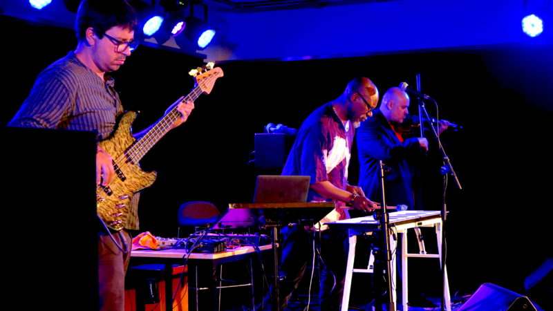 Tiago Coimbra (bass), Orphy Robinson (vibes) and Benet McLean (violin). (photo: Tony Benjamin)
