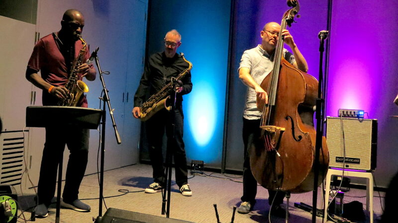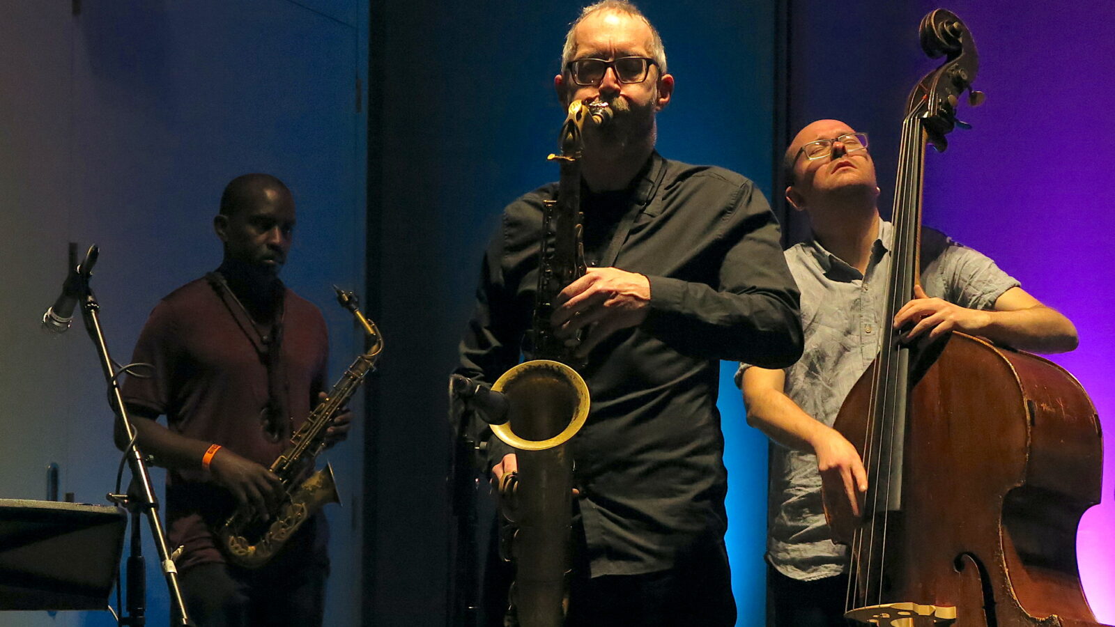 The project was started to celebrate the compositions of pianist Andrew Hill and trumpeter Booker Little and they opened with Hill’s Black Fire, a storming triple-time piece that gave the three horn players solo spots to set out their wares, Jake swerving and swooning around the tune, Nick wrestling it into submission and Jason squeezing and spurting it back into shape. Drums and bass roiled together while stabbing brass comments punctuated the solos and steered things towards a brash three-part finale. It was joyful music, full of energy and creativity with a gently disciplined freedom.