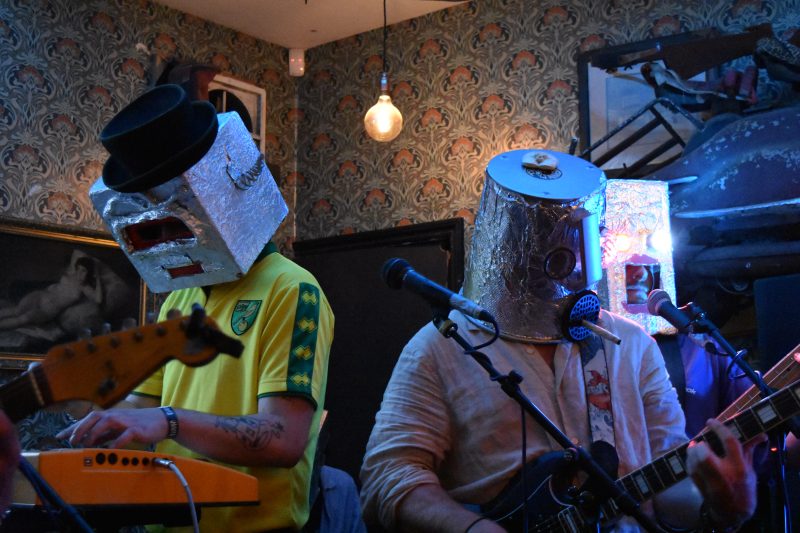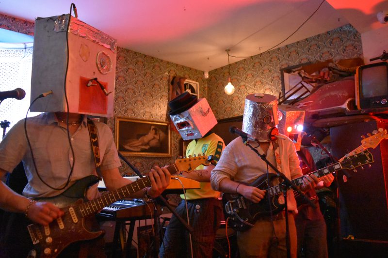 Trans-Siberian Express cause the first roadblock of the day, packing out Ill Repute and then some. The sextet, famed locally for their guerilla gigs in lifts and on the street, present upbeat jangly indie with a hint of Tom Waits and a chaotic Beefheart energy, complete with wailing harmonica – they call it ‘schwank’ or ‘splurge-pop’ – and it’s facilitated by homemade foil-covered robot heads that they don after the first number and don’t take off except to occasionally come up for air which one guitarist accompanies with a sweaty, wild-eyed “fuck!”