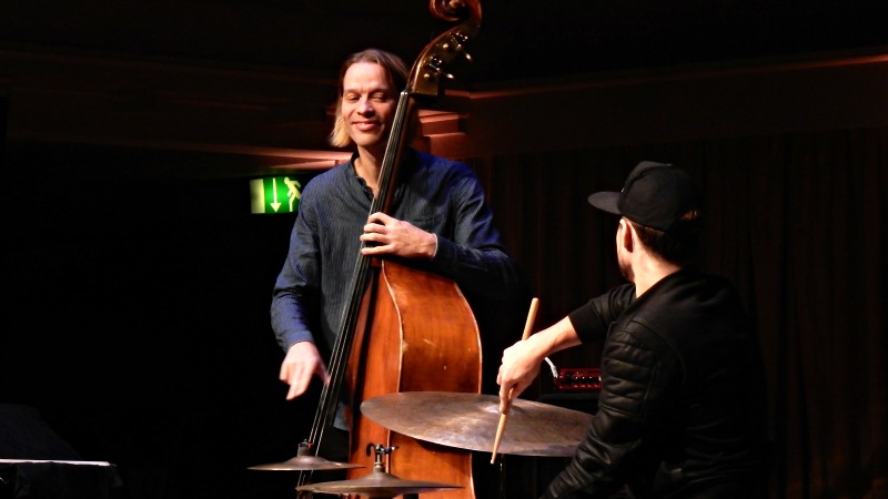 The gig celebrated Parallax, the latest album famously recorded in a single day this year, and it would have been interesting to have spent more time listening to it beforehand in order to see how much of such a spontaneous creation was retained in this equally spontaneous performance. While there were themes and structures to pieces like Just 4 Now or 67,000 mph you could hardly speak of melody as such, more a kind of harmonic idea and atmosphere sustained by the trio’s exact understanding of how it should be. OK Chorale was a case in point – after Neame’s stately neo-classical introduction it rocked into a brisk trot, Eger flailing enormous soft brushes over his kit in silent tumult, Høiby’s bass jumping and punctuating the stops and starts that eventually freed a drum solo. At all times there was a sense of purpose and some very tight timing between the players, yet it flowed with an effortlessness encapsulated by the wry smiles between the players.