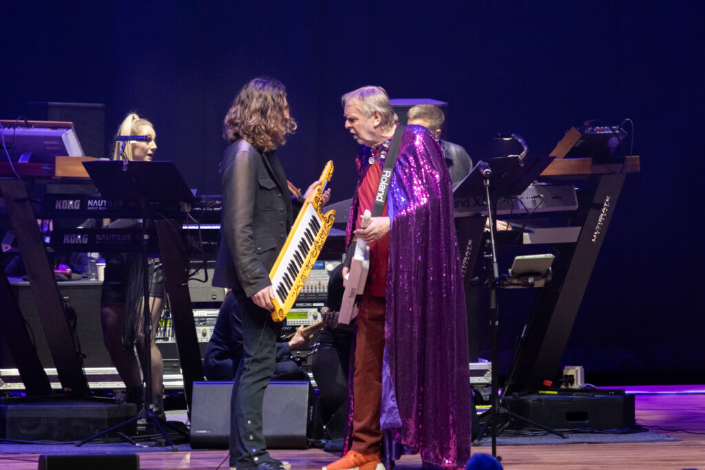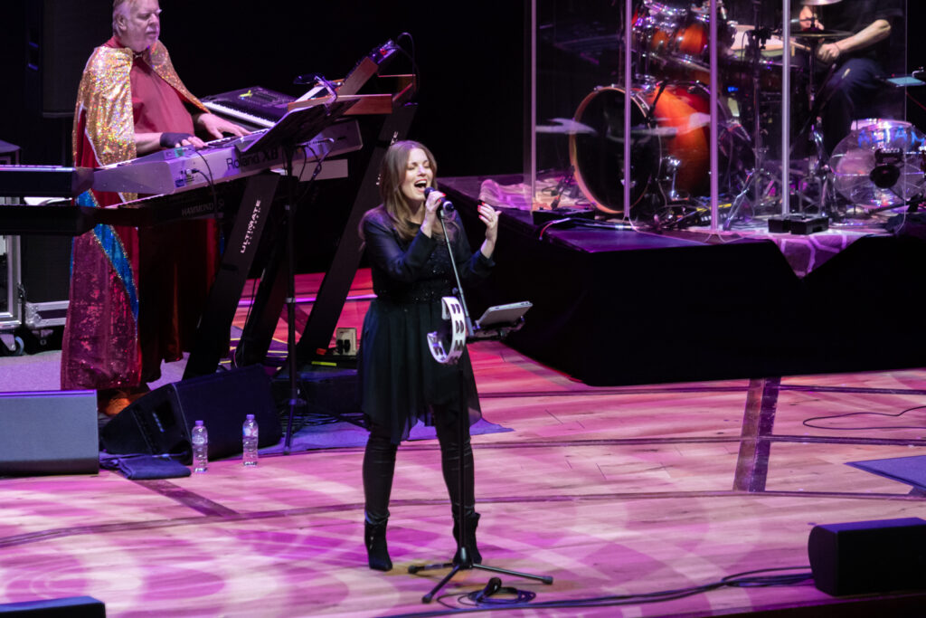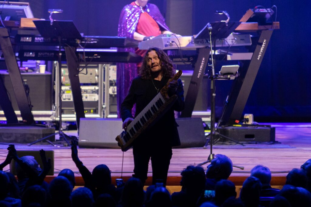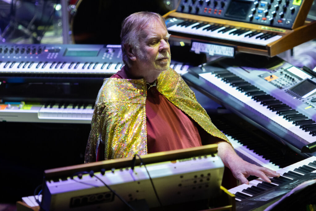 Drummer Adam Falkner is so powerful he’s surrounded by a prophylactic acoustic shield. Also proving hugely impressive are the BVs – a close harmony trio of backing singers, who provide a scintillating intro to The Meeting. Rick himself is as dextrous as ever, occupying centre stage resplendent in his trademark capes (he gets a Madonna-esque costume change at half time) and surrounded by a huge bank of keyboards, augmented by his son Adam on additional keyboards and occasional guitar.