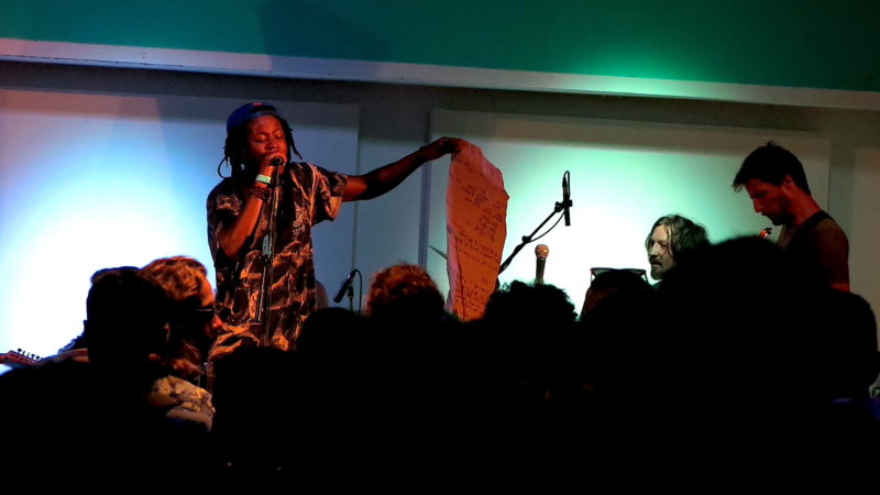 There was more theatre to Solomon OB’s brace of numbers, both in his declamatory performance (reading the lines from a scrolled up piece of wallpaper) and in the way the music rose and fell with the tide of the lyrics. Yet, even when they stoked it, the sound never overwhelmed any of the vocalists – a tribute to their judgement and the generally excellent mixing work from the Strange Brew desk.