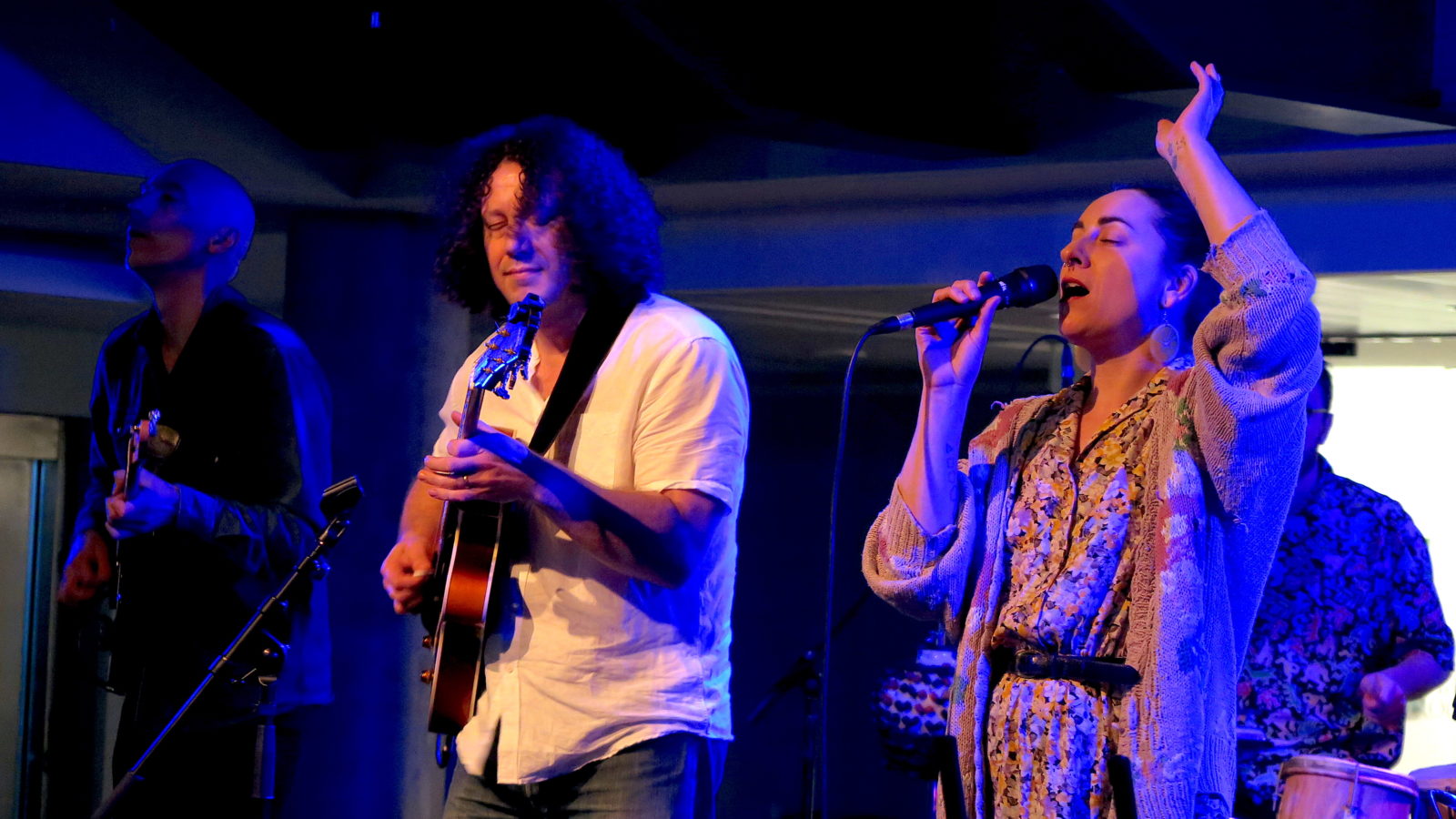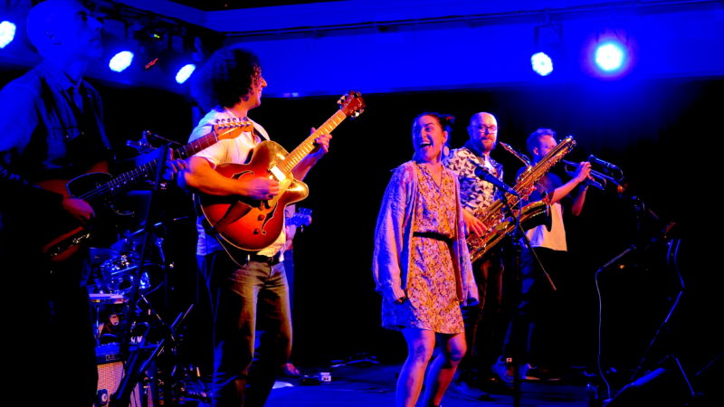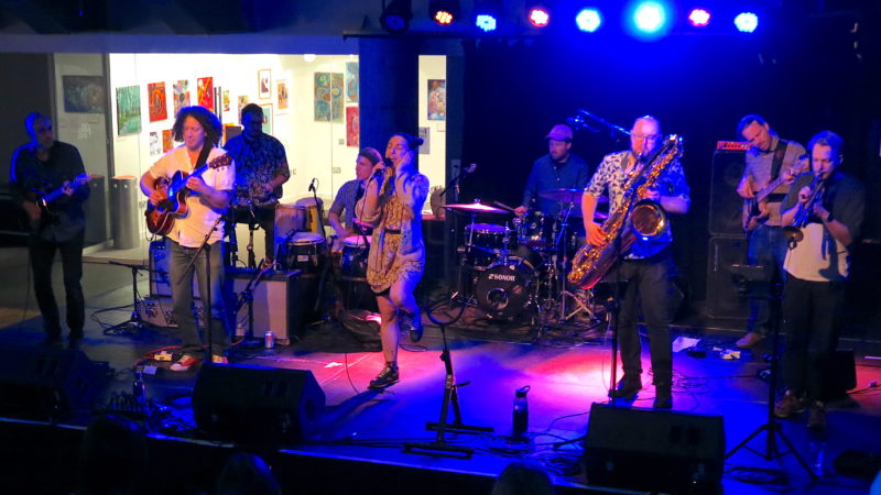 The key to the band’s authentic evocation of classic Nigerian Afrobeat is a backline sound of three well-disciplined percussionists and solid bass playing. That provides both tightness and texture, notably whenever the band shifts up a gear to switch direction during a song, and makes for a fine environment for some fancy solo playing. Thus the song Animal took shape from a percussion interplay, layering in the other instruments before suddenly getting everything in lockstep. The song is an impassioned plea for tolerance between people and Marie’s full-throated performance ushered in an inspired guitar solo from Justin Goodall, urged on by stabs of brass harmony – a guaranteed crowd-pleaser that worked a treat.