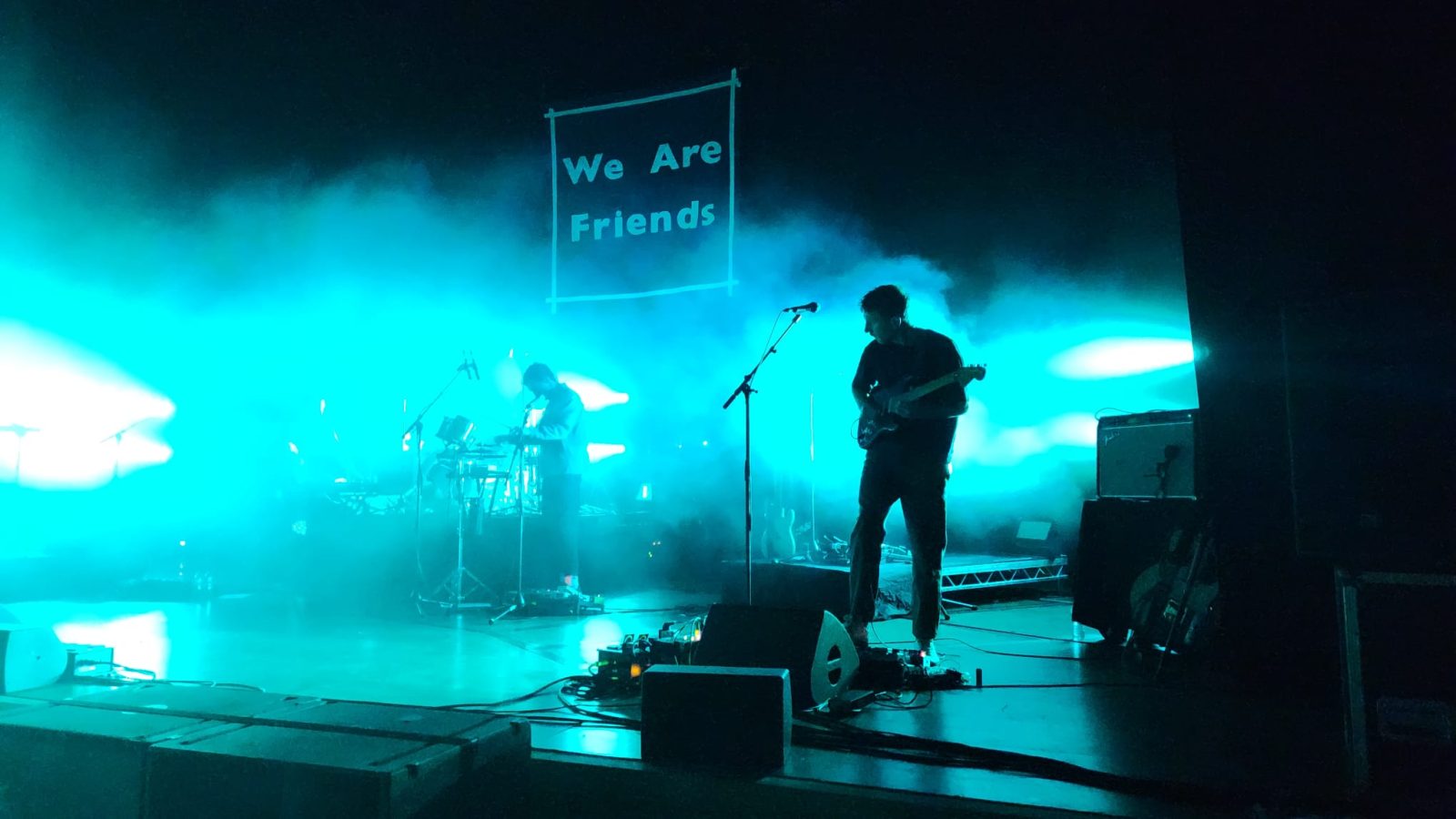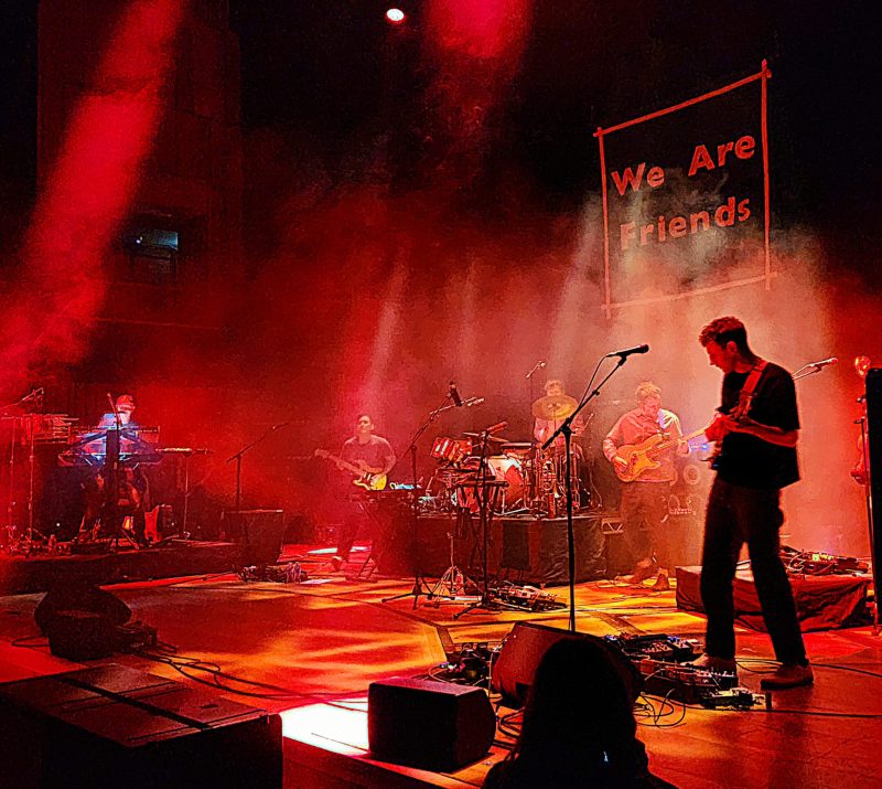 WE ARE FRIENDS the backdrop reads as fans applaud, with one barrier-clinging fan shouting “Welcome home!!” as Squid enter the stage and singer/drummer Ollie Judge references the band’s Bristol roots.