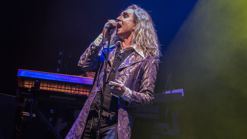 Despite being musically tight, they’re an unlikely looking band, Hackett’s only sartorial instruction seeming to be that they dress in black like their leader. O’Toole favours the smart suit’n’tie look, while Beggs wouldn’t look out of place in an extreme metal band with his long hair, T-shirt and tattoos. But here comes Nad Sylvan to add a touch of flamboyance to the second set. He’s resplendent in a remarkable full-length purple coat that . . . well, let’s just say someone is probably missing a rather fine pair of curtains. An extraordinarily accomplished vocal chameleon whose timbre is closer to that of Gabriel than Collins, Sylvan is singing mostly Collins-era material tonight which gives us an intriguing insight into what Wind and Wuthering might have sounded like with the Bard of Box on vocals.