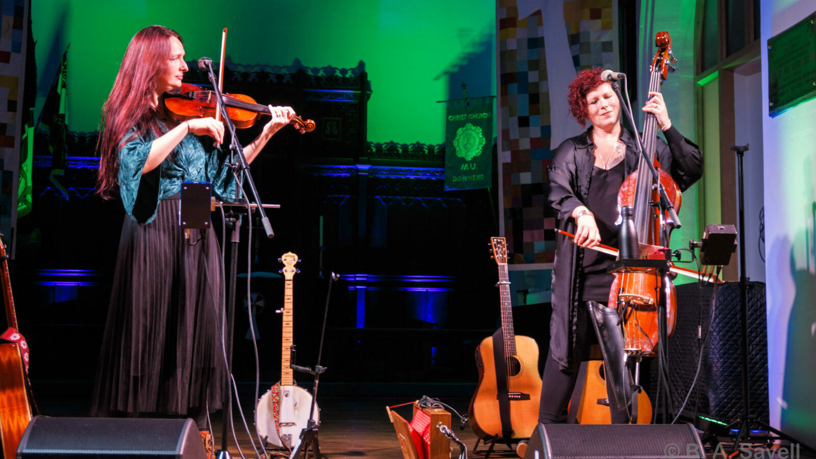 The SykesMartin stage is a very full one. There may just be the two of them but there’s a double bass, several guitars, a banjo, a fiddle and a shruti box.