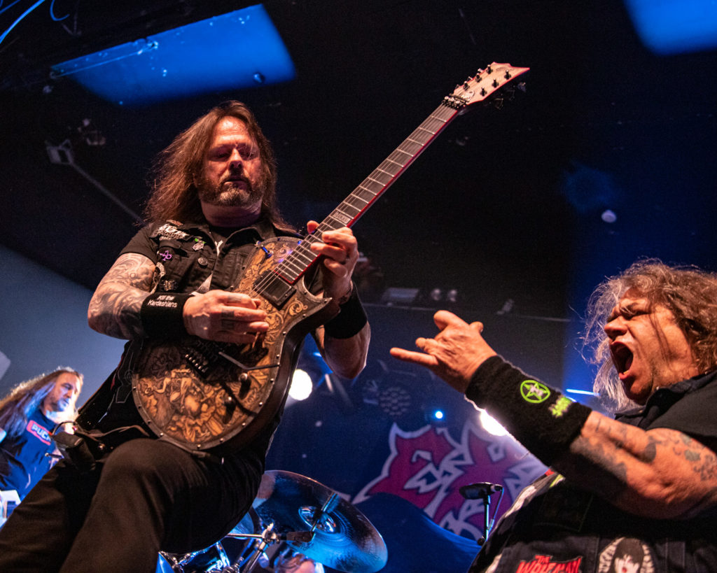 This Bay Strikes Back tour has been wending its way through infected Europe for more than a month now, with just the one cancellation forced upon it in Italy. It’s the first time these three titans of the thrash metal scene in San Francisco’s creatively fertile Bay Area have ever toured together, offering suitably delighted punters a big-value package of more than three hours of double-kick drum abuse, squealy guitar solos and furious chugging rhythms.