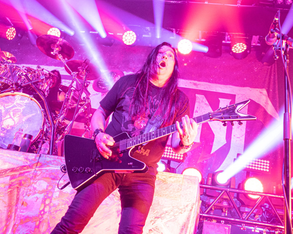Testament really are one of those bands who improve with age. They’ve never been better, or tighter, than they are tonight, probably thanks to being honed to perfection during this lengthy tour. Their not-so-secret weapon is Alex Skolnick – one of the finest guitarists in this or any other genre, and certainly the only thrash metaller to moonlight with his own jazz trio. He makes full use of the two ego risers at his disposal so every drooling guitarist in the audience can observe the full fretboard action.