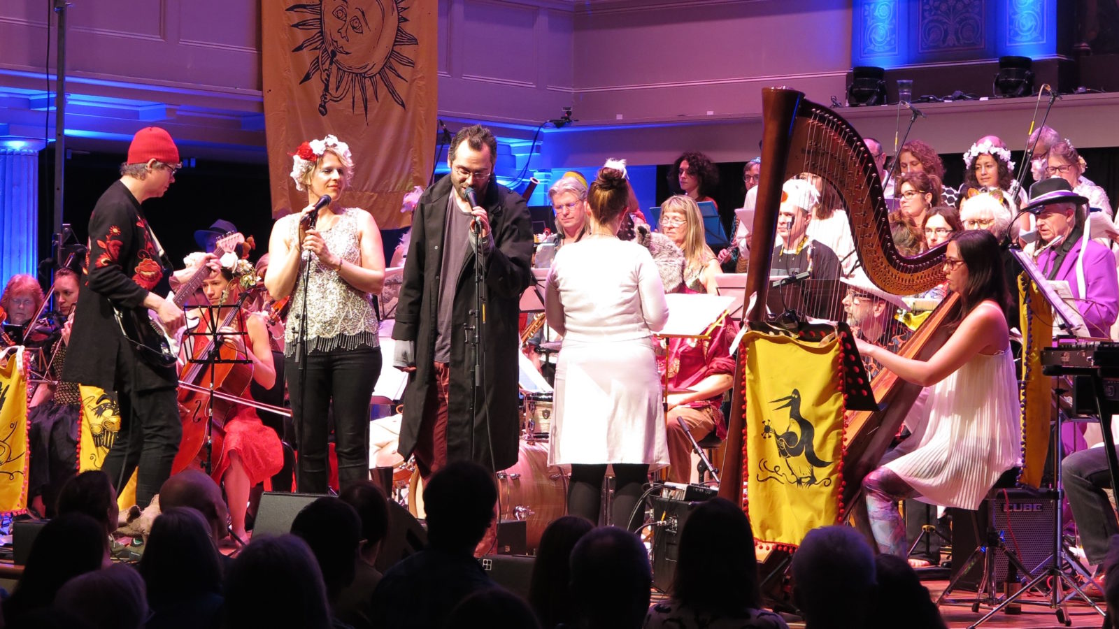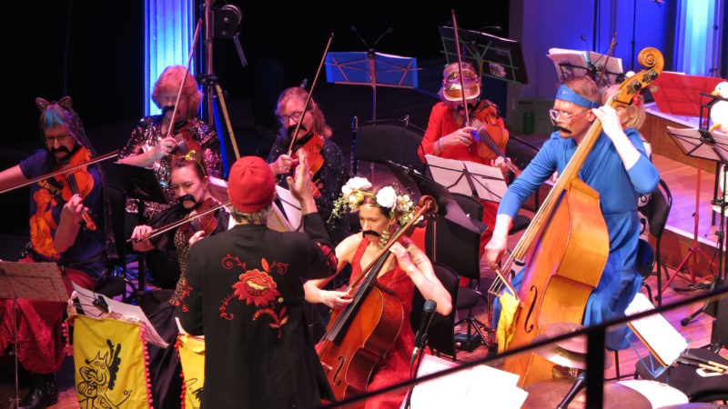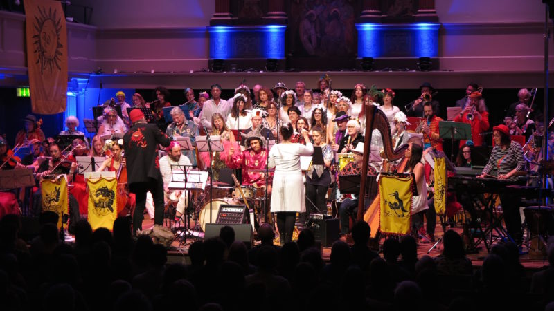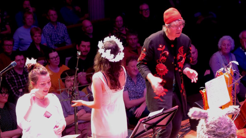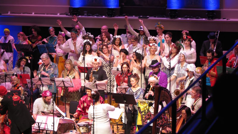 Given the sprawling enormity of the whole choir and orchestra ensemble (motto: ‘more is more’) it was a good idea to spend the first half of the evening in a Young Person’s Guide to the (Fantasy) Orchestra, with different sections taking the stage for a couple of party-piece numbers each. Thus the choir drifted through the auditorium to a minimal reading of Santo & Johnny’s moody instrumental Sleepwalking while Jesse conducted a stage of empty seats, the wind section (‘Honking Geese’) bravely covered a Three Cane Whale tune in the style of Michael Nyman, the strings donned ludicrous moustaches for Bohemian Rhapsody, the percussion explored a clatterfest in 7-time and the brass lovingly rendered Robert Wyatt’s atmospheric Sea Song in rich harmonies.