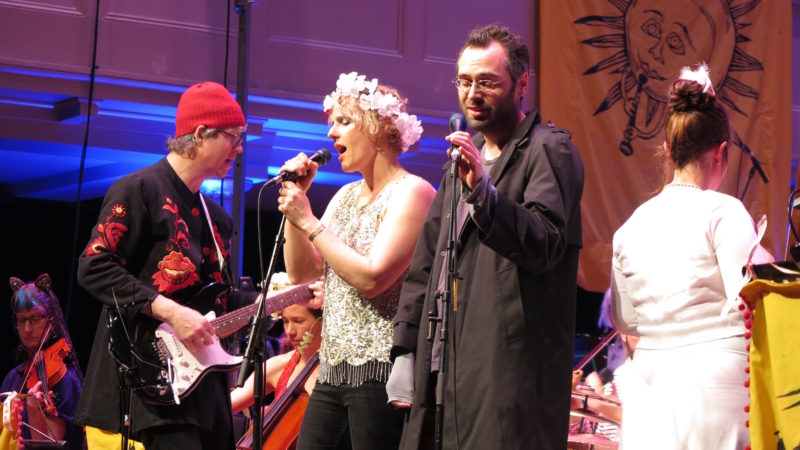 What with the colourfully mismatched costumes and slightly chaotic changeovers (masked by Jesse’s seasoned onstage whimsy) it all had a carnivalesque feel but after the interval, with the full ensemble on stage together things definitely tightened up for the album run-through. Which is not to say too much, of course, and after Disasterpiece’s mellow, Glass-eyed tune Flow the album’s title track The Bear combined deliciously evocative imagery with onstage antics as a string of vocalists filed past, each delivering their one line to Jamie Harrison’s jaunty nonsense song.