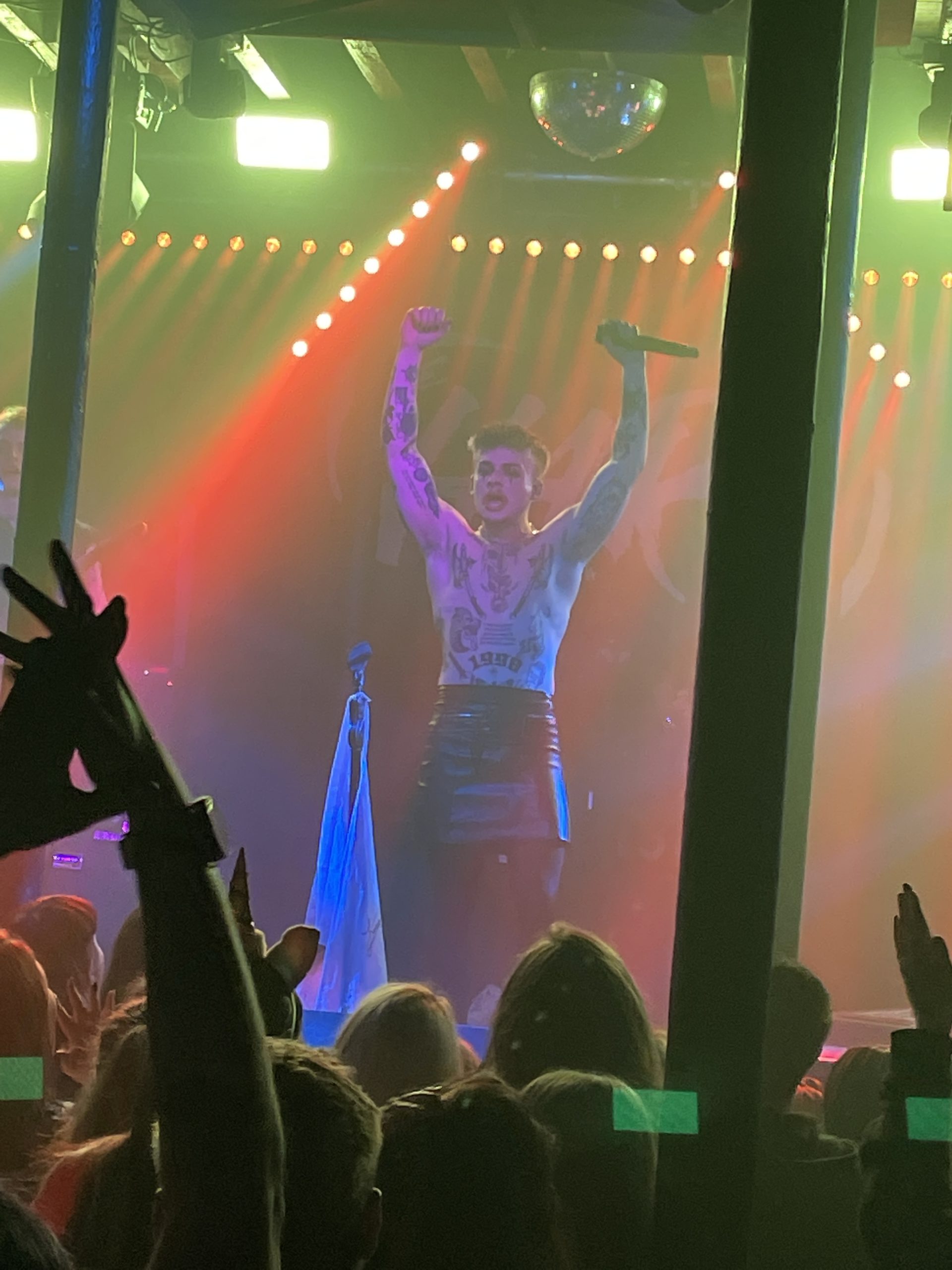 Full of surprises, Tom used the venue to his advantage by climbing and wrapping himself around the pillars in front of the stage, starting mosh pits, stage diving, doing headstands on stage, the list goes on. At one point, he performed a magic trick on himself by vanishing into the darkness and then appearing to stand up on the main bar. Tom had the whole crowd under his control and he knew what he was doing.