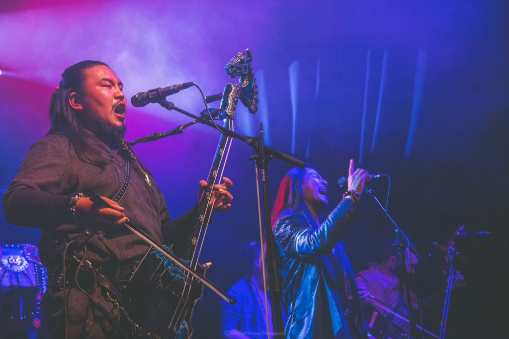 Finally, the Mongolian horde arrive on stage. And quite a mini-horde it is too, the band’s four key classically trained members who play traditional acoustic instruments being augmented by an additional quartet, comprising a brace of drummers and a guitarist and bassist. It must be a sound engineer’s nightmare getting the balance right. But the combination works brilliantly, with the thunderous rhythms and electric instrumentation super-charging the band’s rockin’ onslaught without ever succumbing to the sonic bloat that results when, say, Eric Clapton appears on stage surrounded by 17 musicians.