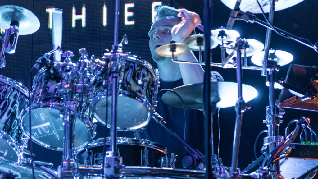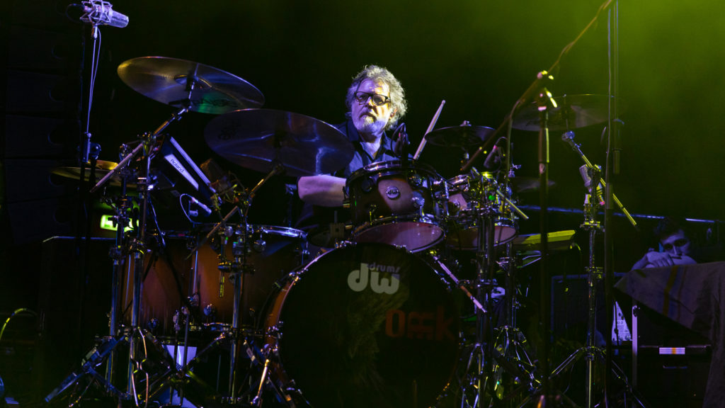 A distinctive and imaginative player, Mastelotto occupies the opposite side of the stage with his impressive kit. During Time Corroded, there are moments when he even forsakes the drums altogether to concentrate on battering his array of cymbals.