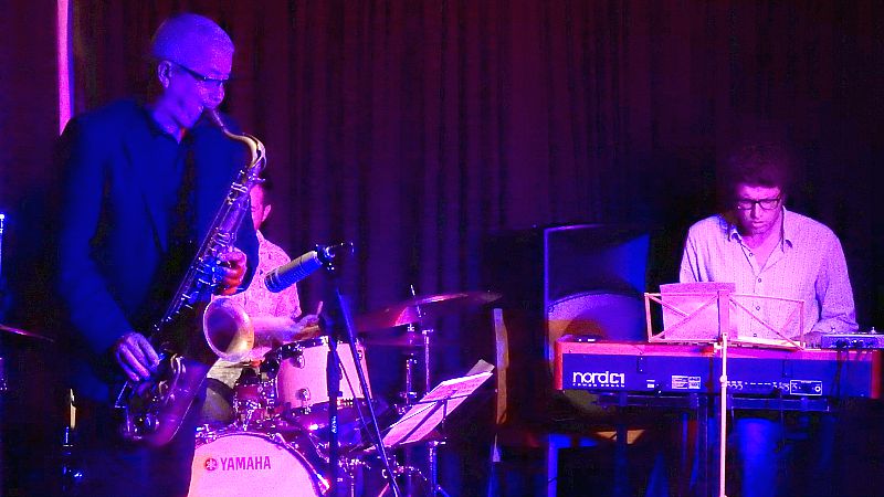 From that point on the evening offered a superb sequence of numbers varying in mood from a (literally) staggering 3-time reggae version of I Only Have Eyes For You, a heavily-disguised, drum-led Caravan and a hauntingly simple rendition of Only Love Can Break Your Heart with full-effect church organ making it the ideal (if ironic) wedding waltz. But it was the two pieces either side of their set break that really showed what the Pushy Doctors could do as an empathetic trio, less solo dominated in favour of a group process. In their hands smooth jazz anthem Forever And A Day became a slow, sepulchral piece, falling chord changes and questing melody recalling the more atmospheric side of Esbjorn Svensson, while the beautifully complex arrangement of The Beatles’ Dear Prudence/She’s So Heavy allowed the melody to assemble subtly by inference and showcased Andy’s assertive soprano sax. HIs increasingly torrential playing ricocheted off Mark’s deconstructive drumming, the whole piece implacably held together by Dan’s stoic keyboard.