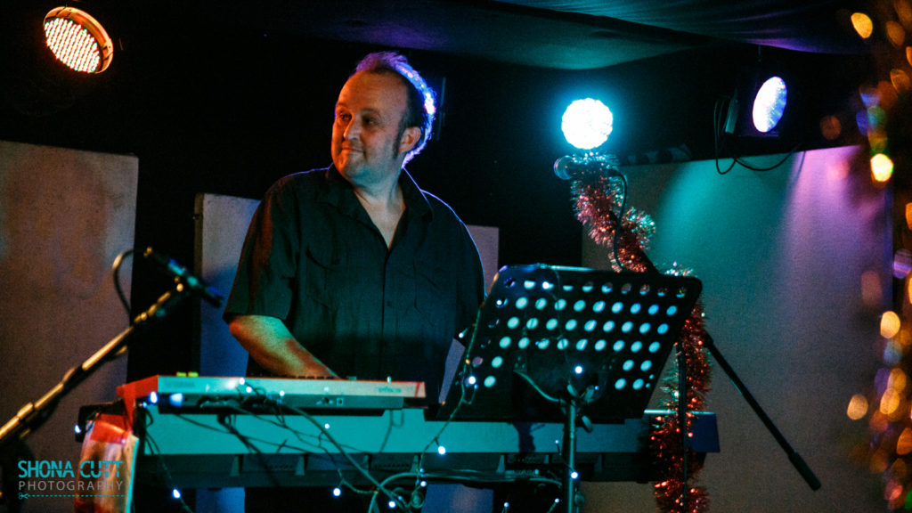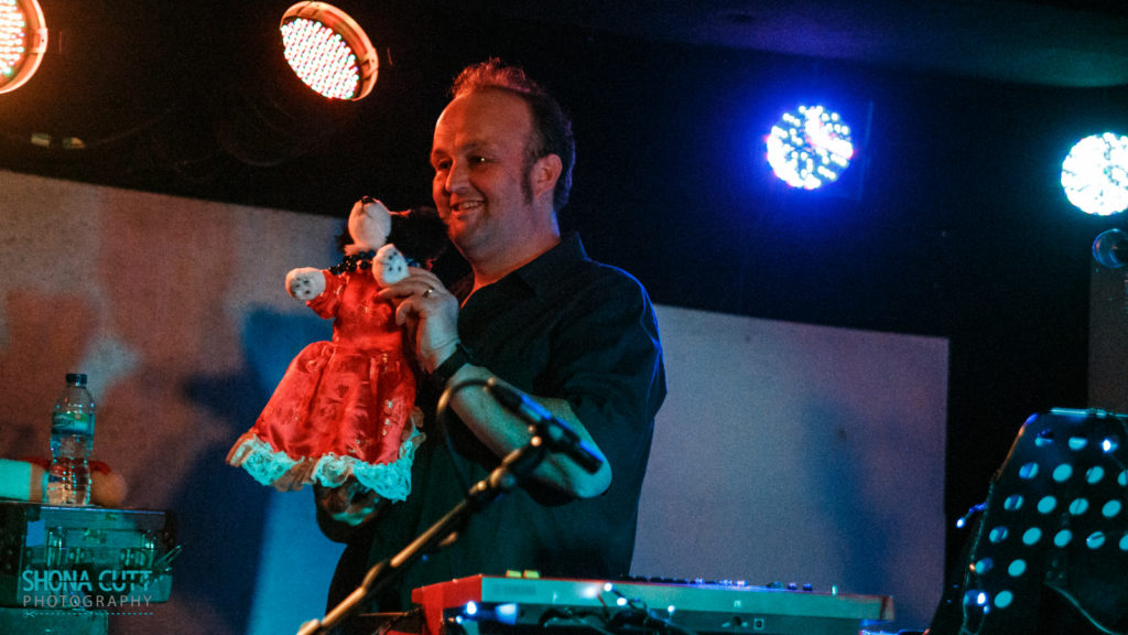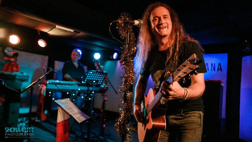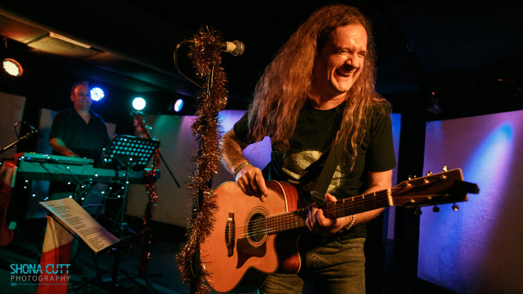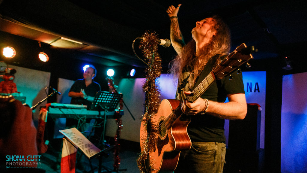 The microphone stands are decorated with tinsel, there are cheesy no-budget festive lights adorning Mr. Kemp’s keyboard, and a faintly creepy toy dog in a dress watches over the proceedings. As if we need to be told, Toby points out that the purpose of the exercise is to have some fun after a hard year of touring. The duo open with acoustic versions of those old Little Angels faves Young Gods and Big Bad World. Then the jollity begins as Toby intersperses songs with questions from the audience, promising to answer anything we care to ask, with BCFM rock DJ Andy Fox on hand with a radio microphone to keep some kind of order.