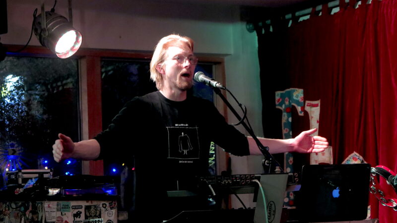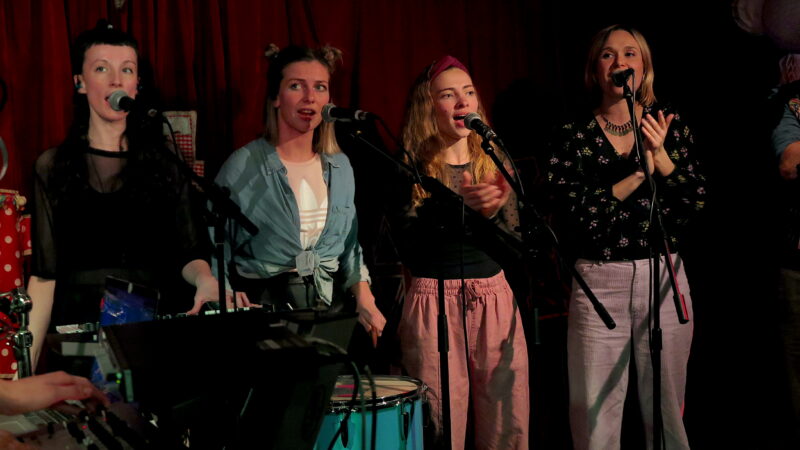 Given the very basic musical resources of voice, drums, hand clapping and occasional droning synth monotones their repertoire had immense variation of sound both between and within the songs. The use of language was important: slightly arcane words and phrases like cumulo nimbus, catastrophising and entice a defilement gave both rhythmic patterns and an atmosphere. Occasionally clear lyrics emerged, such as the defiant unison of “I’m rejected/Reject/I’m rejected/I reject” with it’s echoes of Samuel Becket. That was part of the Cumulo Nimbus song which also featured a five part vocal canon and a big drop, dance music style, that got the increasingly packed Canteen crowd moving.