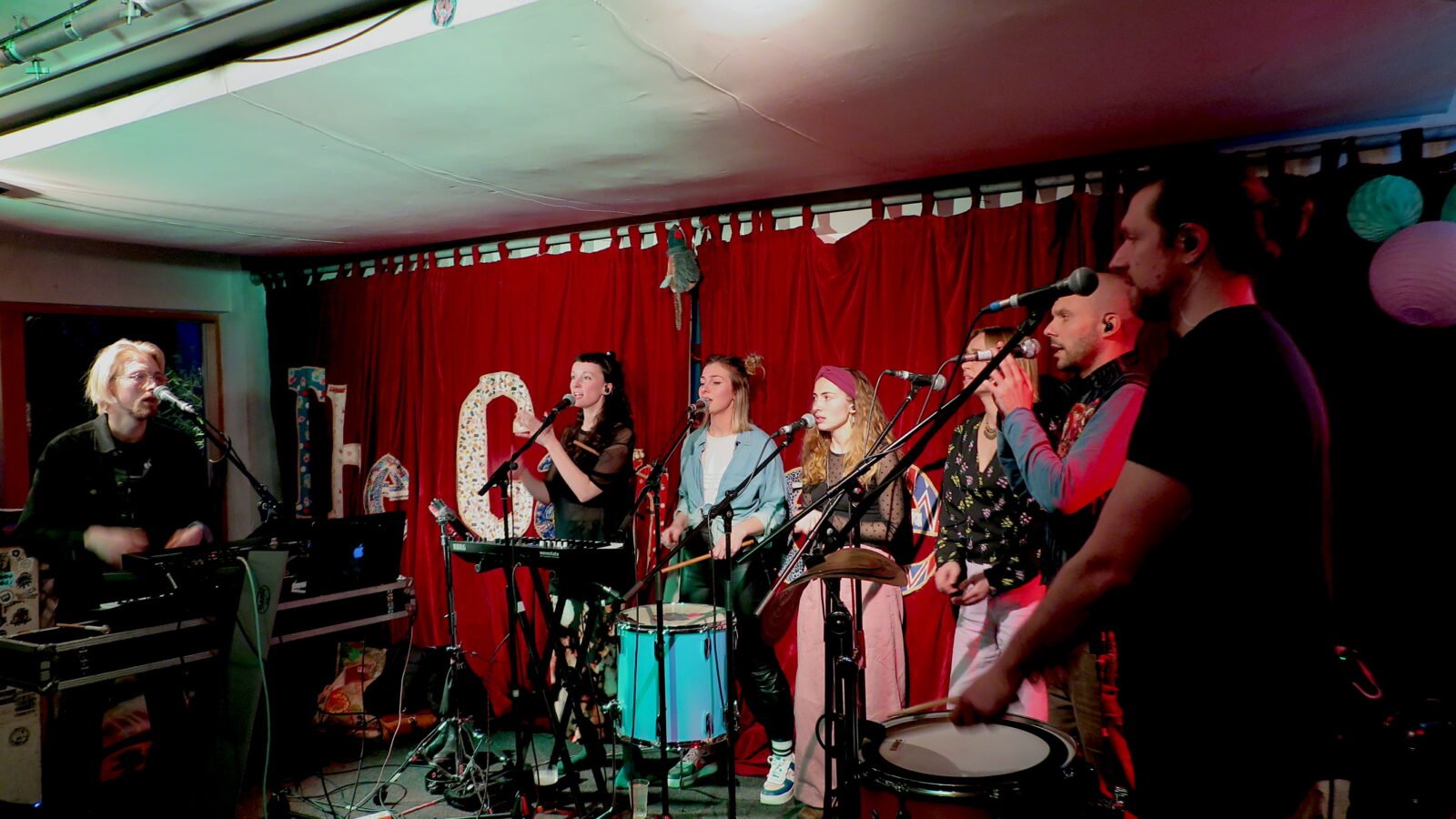 Given the very basic musical resources of voice, drums, hand clapping and occasional droning synth monotones their repertoire had immense variation of sound both between and within the songs. The use of language was important: slightly arcane words and phrases like cumulo nimbus, catastrophising and entice a defilement gave both rhythmic patterns and an atmosphere. Occasionally clear lyrics emerged, such as the defiant unison of “I’m rejected/Reject/I’m rejected/I reject” with it’s echoes of Samuel Becket. That was part of the Cumulo Nimbus song which also featured a five part vocal canon and a big drop, dance music style, that got the increasingly packed Canteen crowd moving.
