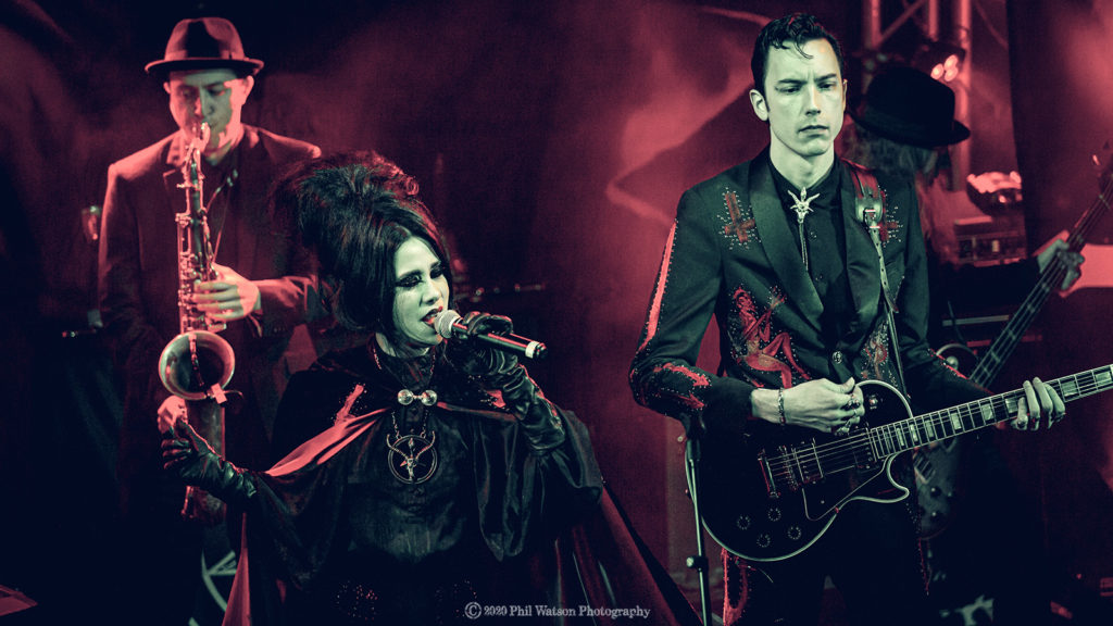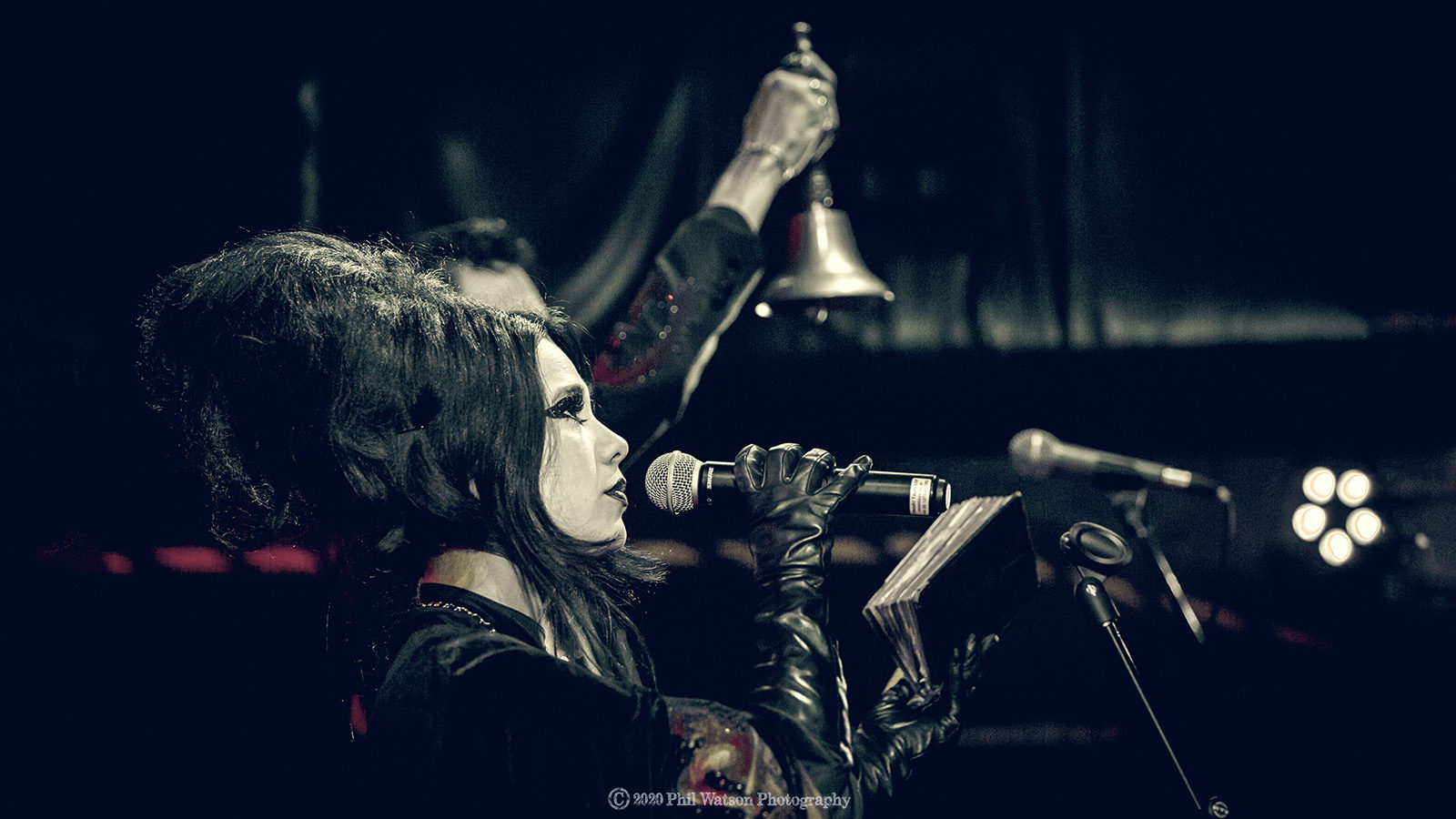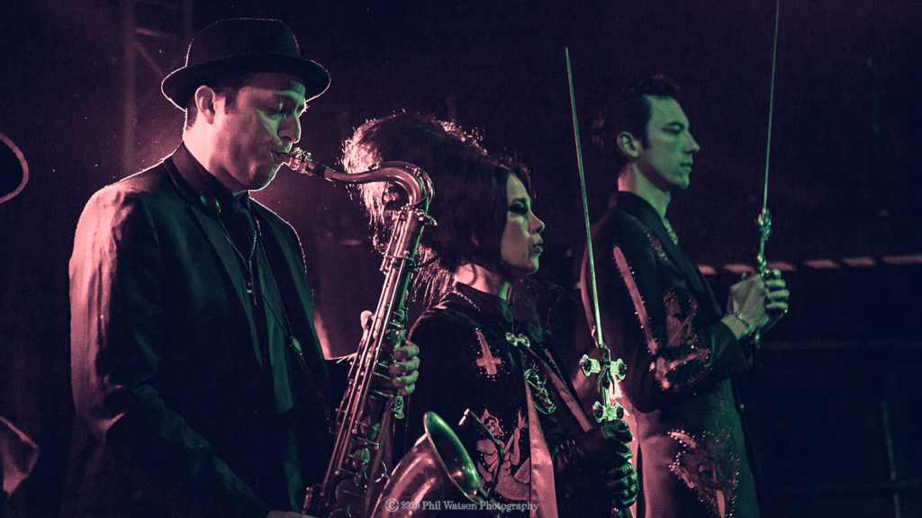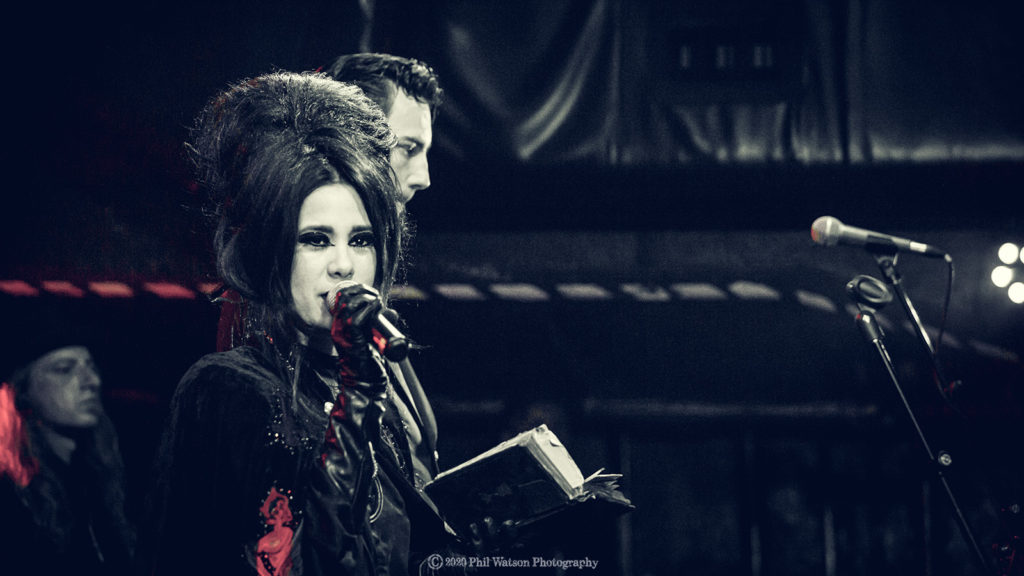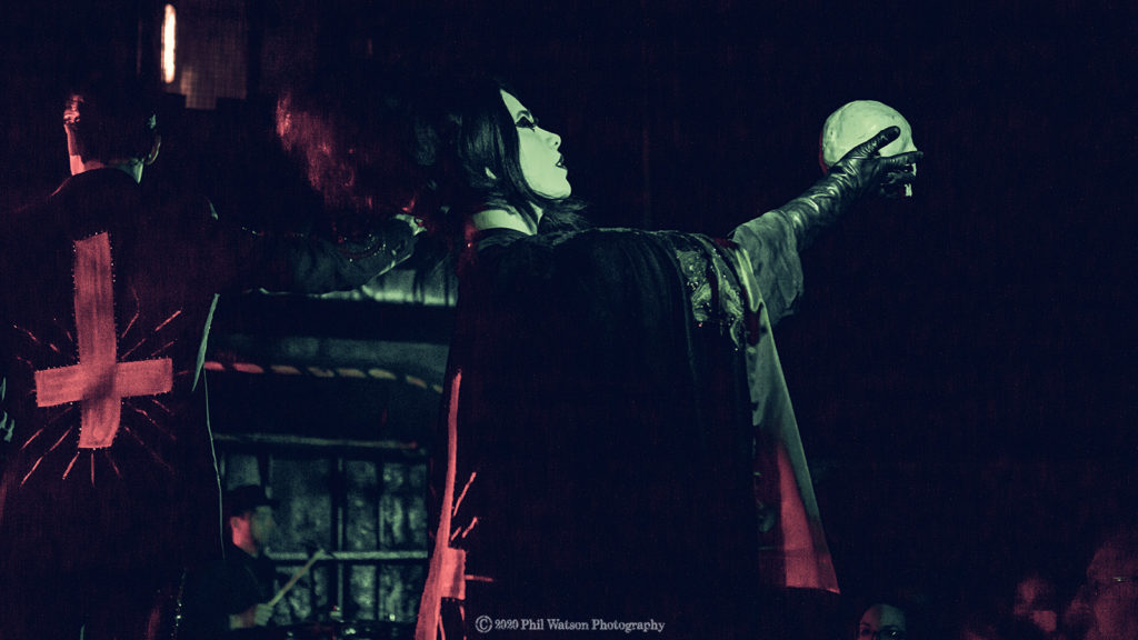 That striking twin inverted crucifix backdrop illuminated by a blood red light, the band take up their positions and keyboard player Jeffrey Howell begins with some suitably ominous organ chords. In another context, this might presage full-on black metal fury. But in this Temple, it heralds the arrival of wife’n’hubby Alexandra and Zachary James for an opening ritual that entails much sword-waving as the former declaims the purpose of the gathering: to summon the flames of Hell to burn down sexism, racism and ignorance. Much gleeful whooping ensues as we bellow the names of Babylon (y’know – as in the Whore), Beelzebub, Lucifer and Lilith. “Are you feeling evil, Bristol?” she demands. We certainly are.