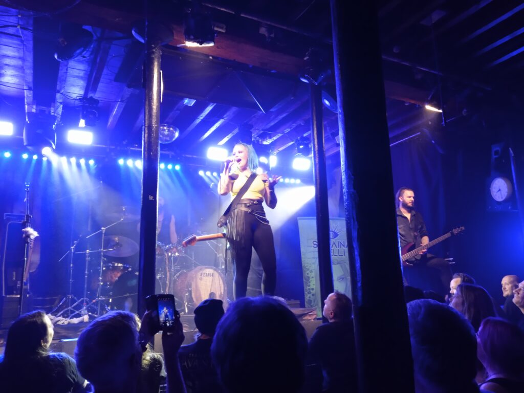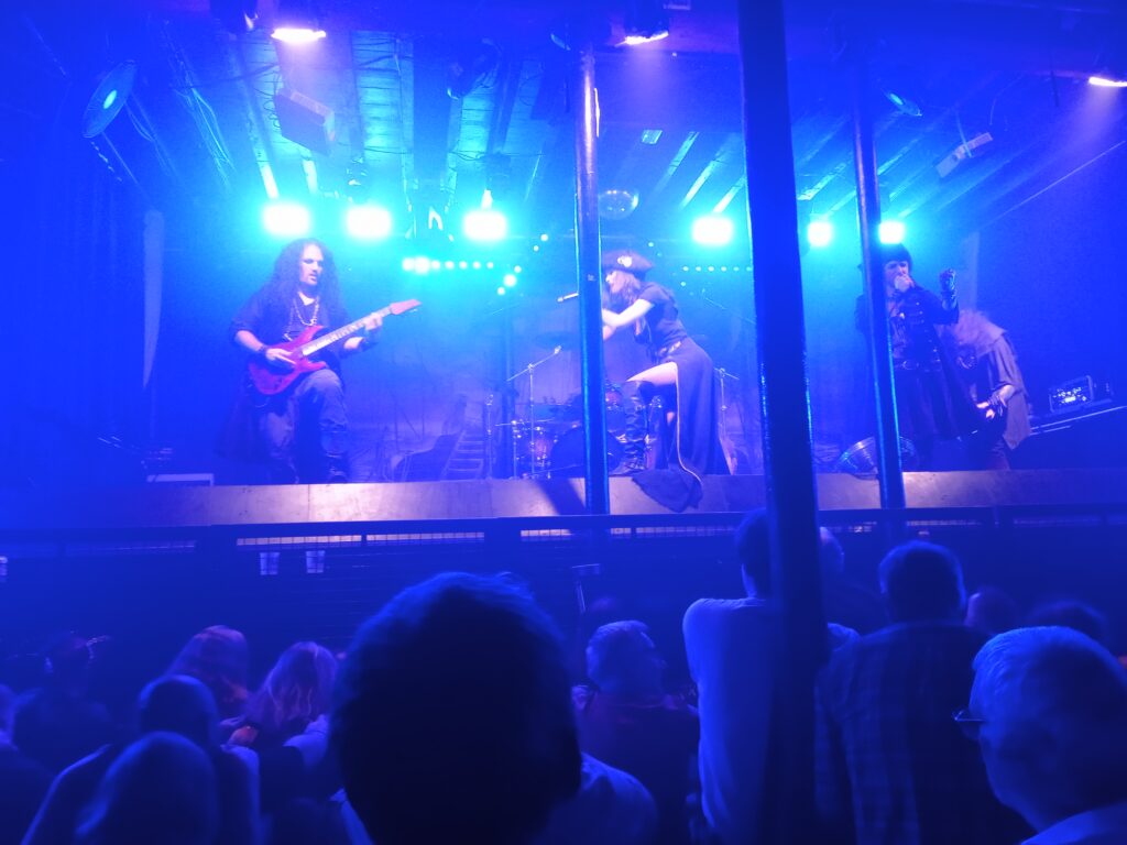 Musically, VoA deviate little from the standard symphonic metal template, but they do have some excellent melodic songs, notably the singalong Clocks and Melancholy Angel, neither of which would be out of place in a hit musical. Most of Pirates gets an airing, in keeping with the show’s theme, though one can’t help feeling sorry for the male members of the band who swelter beneath their heavy costumes during this unexpected return of summer heat. At least Clémentine has a floor-length split dress, which permits some air circulation.