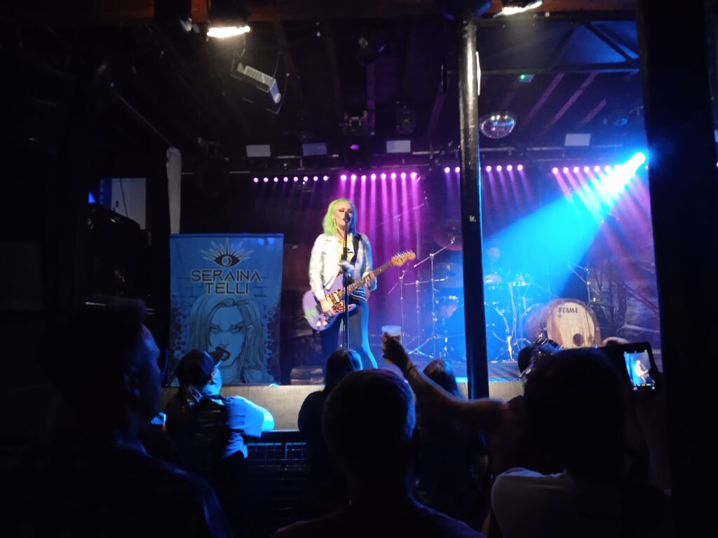 Seraina certainly cuts a distinctive figure with her two-tone blue/green hair and colour coordinated guitars. As she explains during the intro to Addicted to Color, this is her alternative to drugs and alcohol. Hey – whatever works.