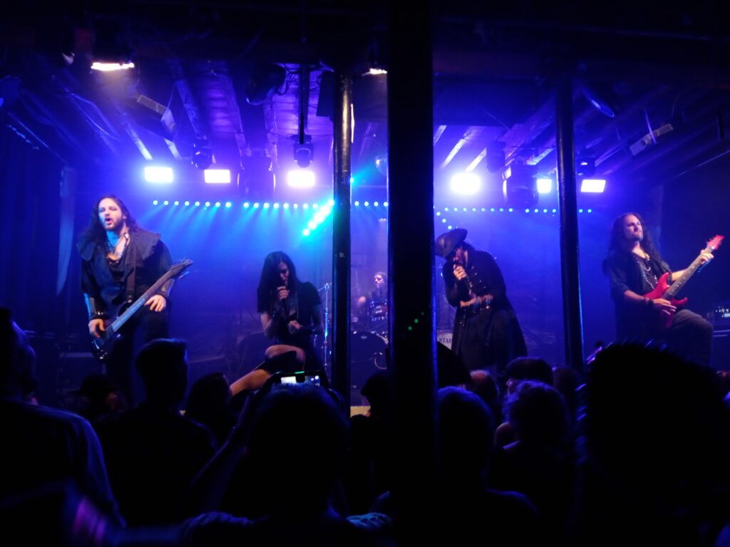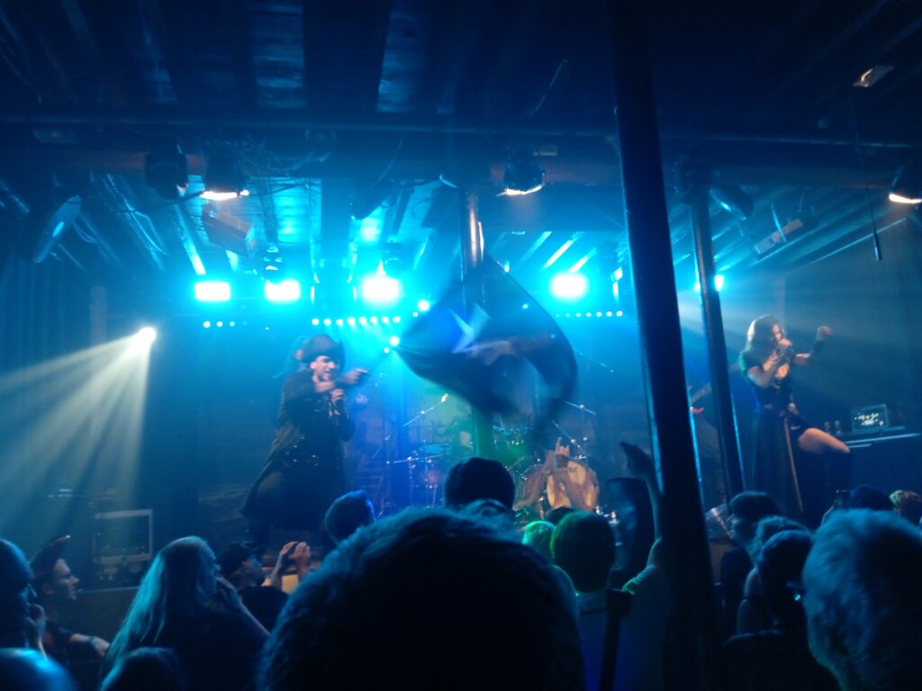 There’s a smattering of pirate hats and at least one plastic sword in the audience – many of which have presumably been stuck in the back of a cupboard since the last Alestorm tour, since there’s an obvious crossover with pirate metal here. But the real surprise about the impressively costumed Visions of Atlantis is just how much fun they are. Squeezing a big theatrical arena show into the Fleece was always going to be a challenge, which is presumably why they left the orchestra at home and have to rely heavily on backing tapes. But there’s no shortage of timber-shivering high jinks instigated by vocalists Clémentine Delauney and Michele Guaitoli. When a pirate hat is thrown into the crowd, only a metal audience could be relied upon to return it politely to the stage. That said, this is a Bristol metal audience, which means there’s no shortage of hecklers. The show’s shtick is that we’ve all being recruited to Visions of Atlantis’s pirate crew. “Are you ready to join us?” asks Clémentine. “What’s the pension like?” demands a bloke down the front. And when she tells us that A Life of Our Own celebrates our freedom to “be who we are” everybody replies “Arrrrrr!” in their best pirate.