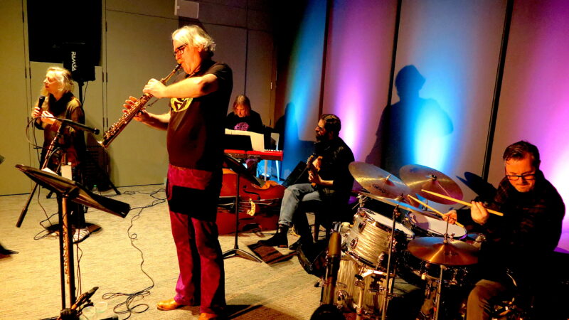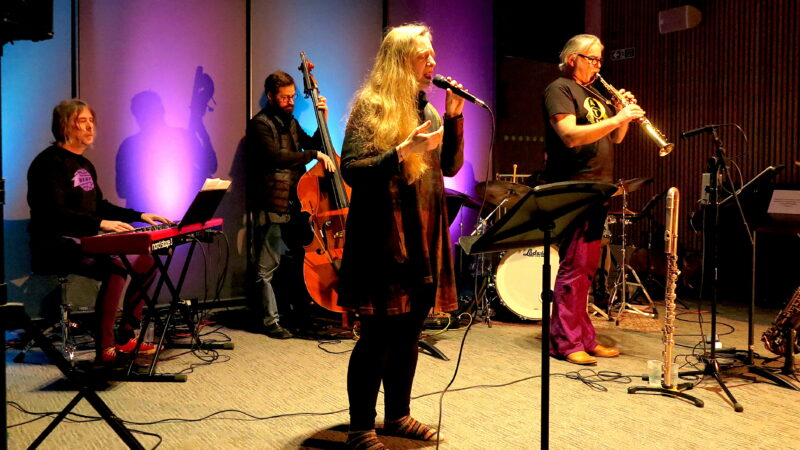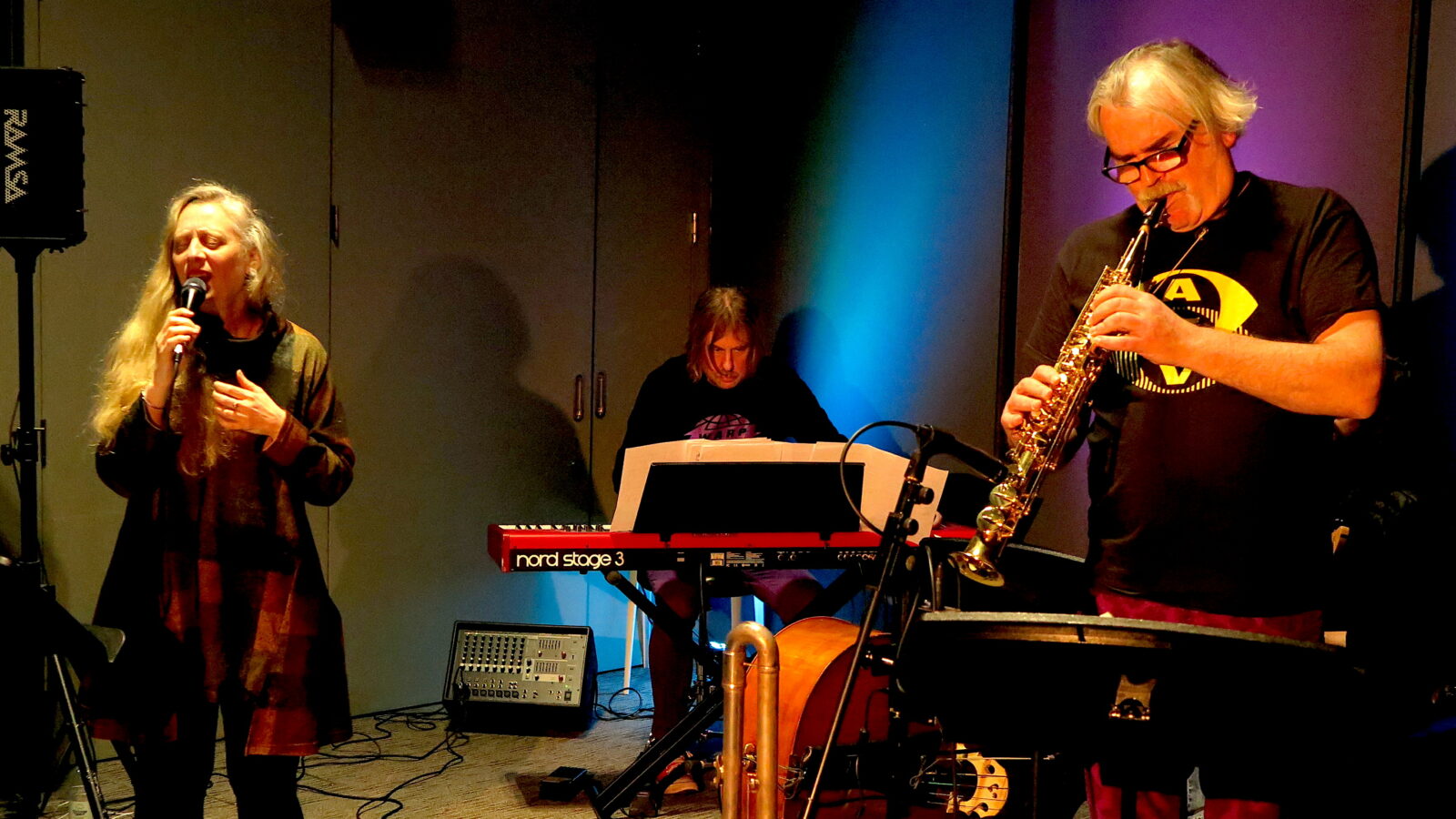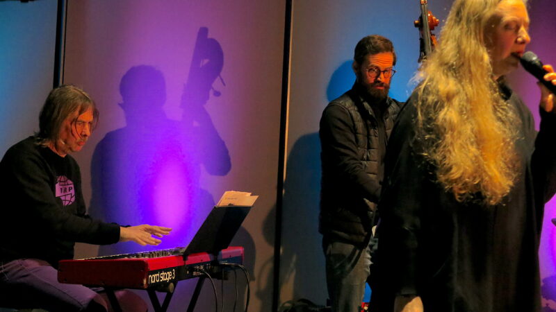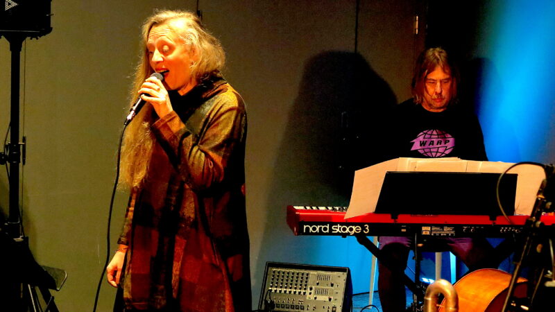 “There’s a little something for everybody tonight.” Kevin promised, announcing Dot Dash, a Morse Code themed piece fuelled by hard prog energy and insurgent drumming. Brigitte’s bewildered vocal found itself in a disputatious call and response duel with Kevin’s angular saxophone and it ended in agonised vocal wails. In a benign contrast the emollient Blank Out The Night which followed aimed to sooth a troubled child with gentle singing and mellow alto flute. The Time Is Come would have been a conventional Bossa nova if it hadn’t been in 7-time yet it flowed smoothly nonetheless, providing Kevin with another creative alto solo that was somehow skittish and rueful at the same time. And then there was Patterns of Decay – an abstract instrumental beginning with bursts of roaring grumble that, indeed, decayed into a thin mix of (intentionally) aggravating sounds. It had the feel of a sinister soundtrack, harshly metallic, beneath Brigitte’s laconic vocals.