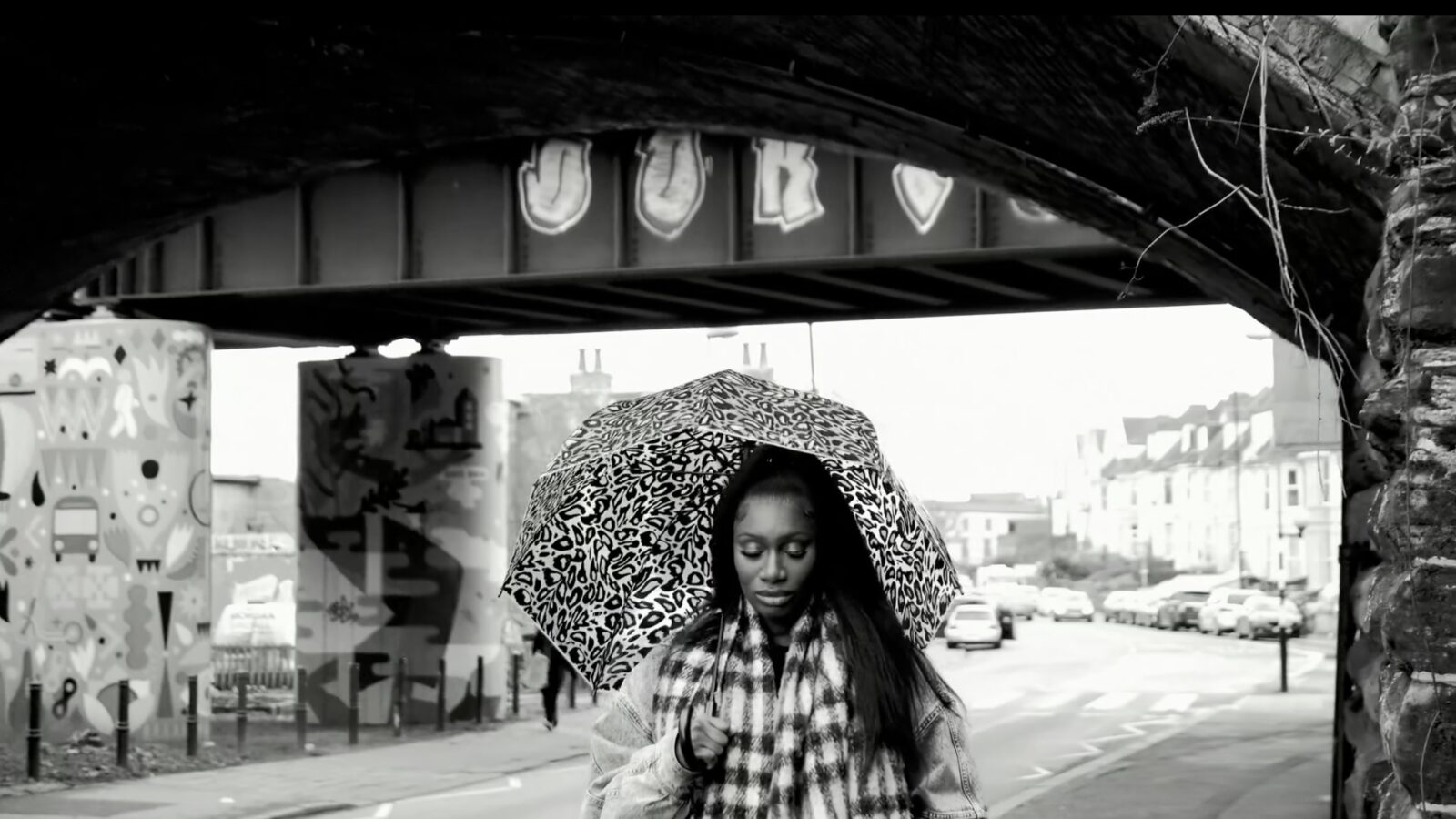 In boots, denim jacket and with leopard print umbrella in hand, the singer – formerly of Dub From Atlantis and a regular in Dr Meaker’s live band – walks past Easton landmarks singing of real love that ‘feels like shelter from the rain.’