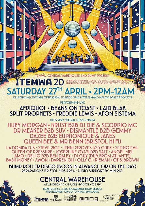 Temwa 20th anniversary party will be acoss three stages from 2pm until 12am and include an outdoor stage, kids area and a bump roller disco.