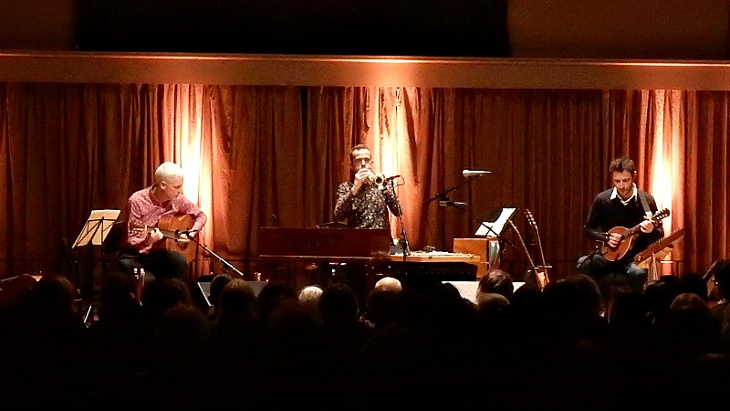 The music’s dynamic shifts meant paying acute attention, with even the creak of a leather jacket somewhere in the audience adding to the mix at times, but the three players were oblivious to such distractions. The complexity of the pieces and their sheer number – rarely do they last more than a couple of minutes – represented an amazing feat of memory that required intense concentration, though the relaxed manner of Pete Judge’s between-song banter gave the lie to that. It was interesting to note the evolutions from older tunes to the tracks from Palimpsest, with established favourites like the cascading Sluice or the urgent Eggardon Hill seeming less elaborated than the haunting autumnal exploration of The Bronze Sounding or the positively orchestral Gospel Pass. That latter, the album’s closing number, saw them joined by Maarja Nuut and cellist James Gow, both having played on the recording, and the additional complexity of string sound hints promisingly at explorations for the future, perhaps. But for the time being there’s more than enough in Palimpsest’s 21 tracks to celebrate Three Cane Whale’s disciplined acoustic intricacy and their seemingly limitless capacity for creative inspiration.